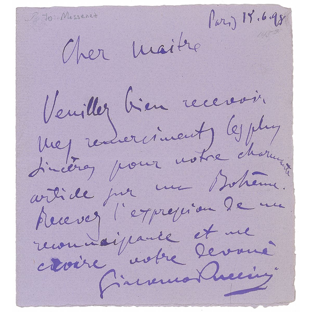 Boldly penned ALS in French, one page, 5 x 5.5, June 5, 1898. Letter to “Cher maitre,” identified at the top in pencil as the accomplished composer Jules Massenet. In part (translated): "Please accept my most sincere thanks for your charming article on my Boheme. Accept this expression of my gratitude.” In fine condition. La Boheme, Puccini’s fourth opera, was his first major success and arguably his greatest work. It debuted in Turin in February 1896 and was quickly adopted into the international repertory. As Massenet was one of the leading French opera composers of the era, his compliments would have been especially well appreciated.