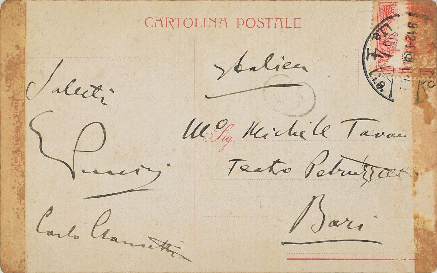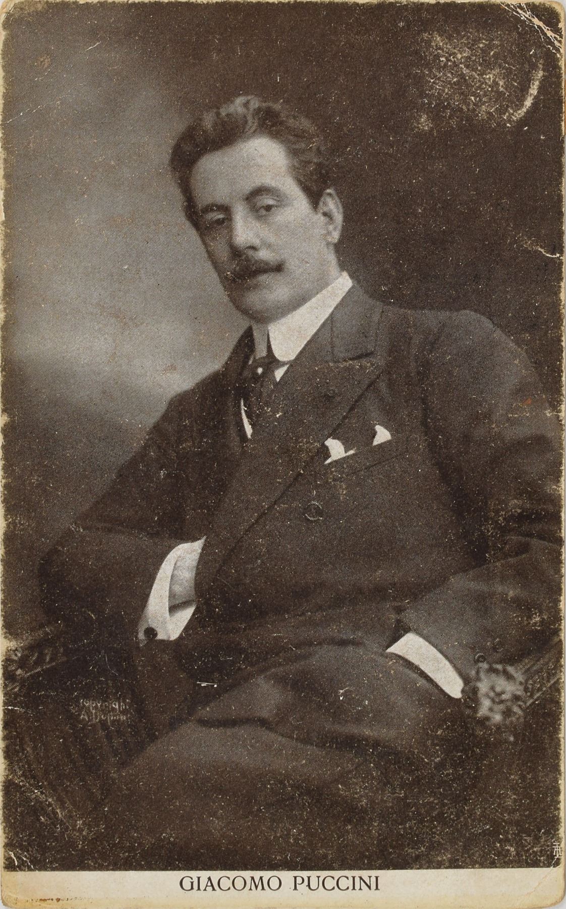 Desirable 3.5 x 5.5 Italian postcard depicting Puccini, signed on the reverse in black ink, "G. Puccini.” In very good condition, with light foxing, scuffing, and old tape to the edges of the signed side.