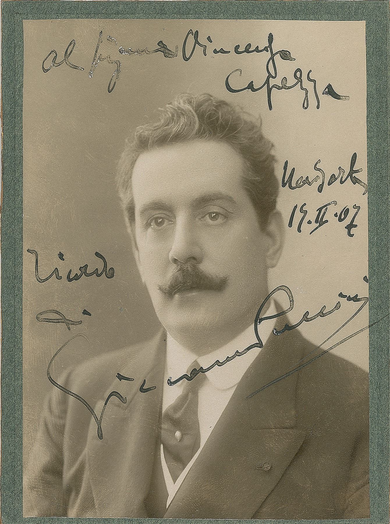 Vintage matte-finish 3.75 x 5.25 head-and-shoulders portrait of Puccini, signed and inscribed in fountain pen in Italian, "Giacomo Puccini, New York, 19.II.07." Affixed to the original Henri Manuel studio mount. In fine condition, with trimming to the mount, and ink adhesion trouble to one word of the inscription.
