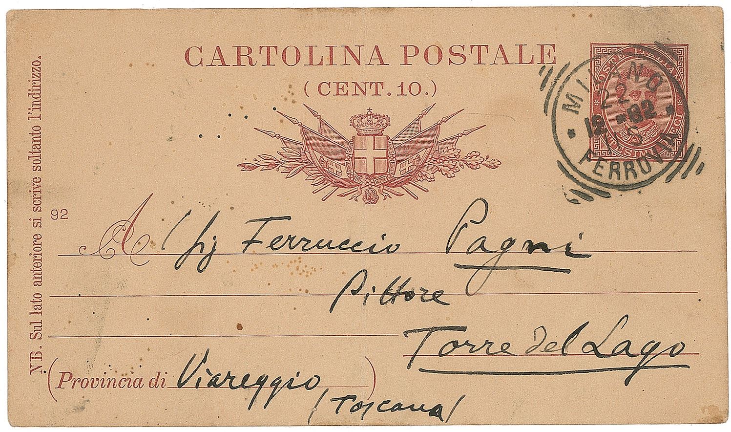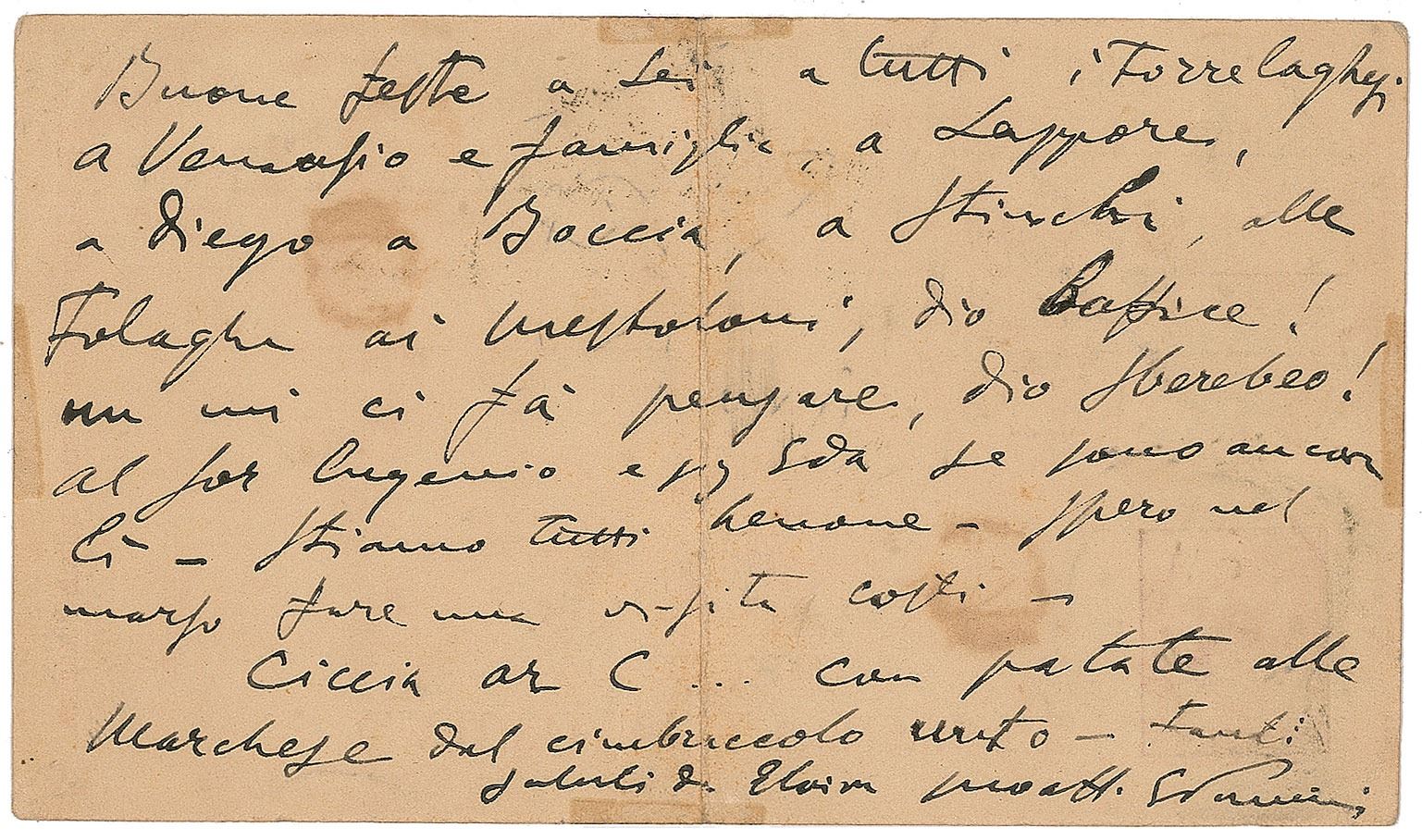 ALS in Italian, signed “G. Puccini,” one page, 5.5 x 3.25, postcard letterhead, no date. Early untranslated letter to the French-Italian painter Ferruccio Pagni. In very good to fine condition, with a central vertical fold, small tape stains at the edges, and two circular stains to the text.