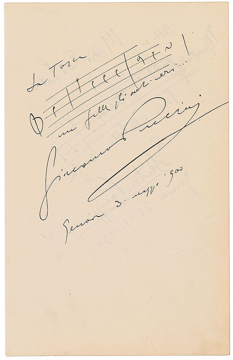 Highly desirable AMQS on an off-white 6.25 x 10 sheet, prominently signed below by Puccini and dated May 3, 1900. Puccini pens three bars from "La Tosca," writing the lyrics below. In fine condition, with light show-through from an unknown AMQS on the reverse. A superb example boasting a sought-after musical quote from one of Puccini's most famous and creative works, which premiered at the Teatro Costanzi in Rome on January 14, 1900. Since that time, the dramatic force of Tosca has continued to captivate performers and audiences around the world.
