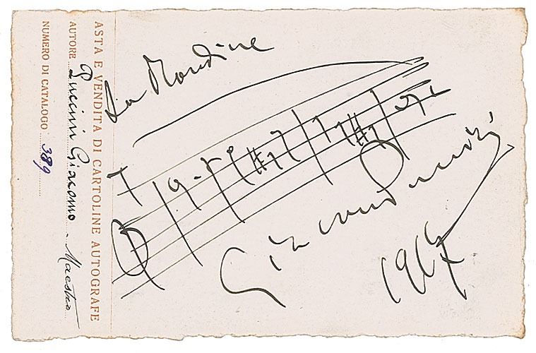 Wonderful AMQS on an off-white 5.75 x 3.5 Italian autograph postcard, signed below in fountain pen, "Giacomo Puccini, 1917," who adds four bars of music from his three-act opera "La Rondine." In fine condition. La rondine was first performed at the Grand Théâtre de Monte Carlo on March 27, 1917. A boldly and attractively penned musical quote from an uncommon Puccini work.