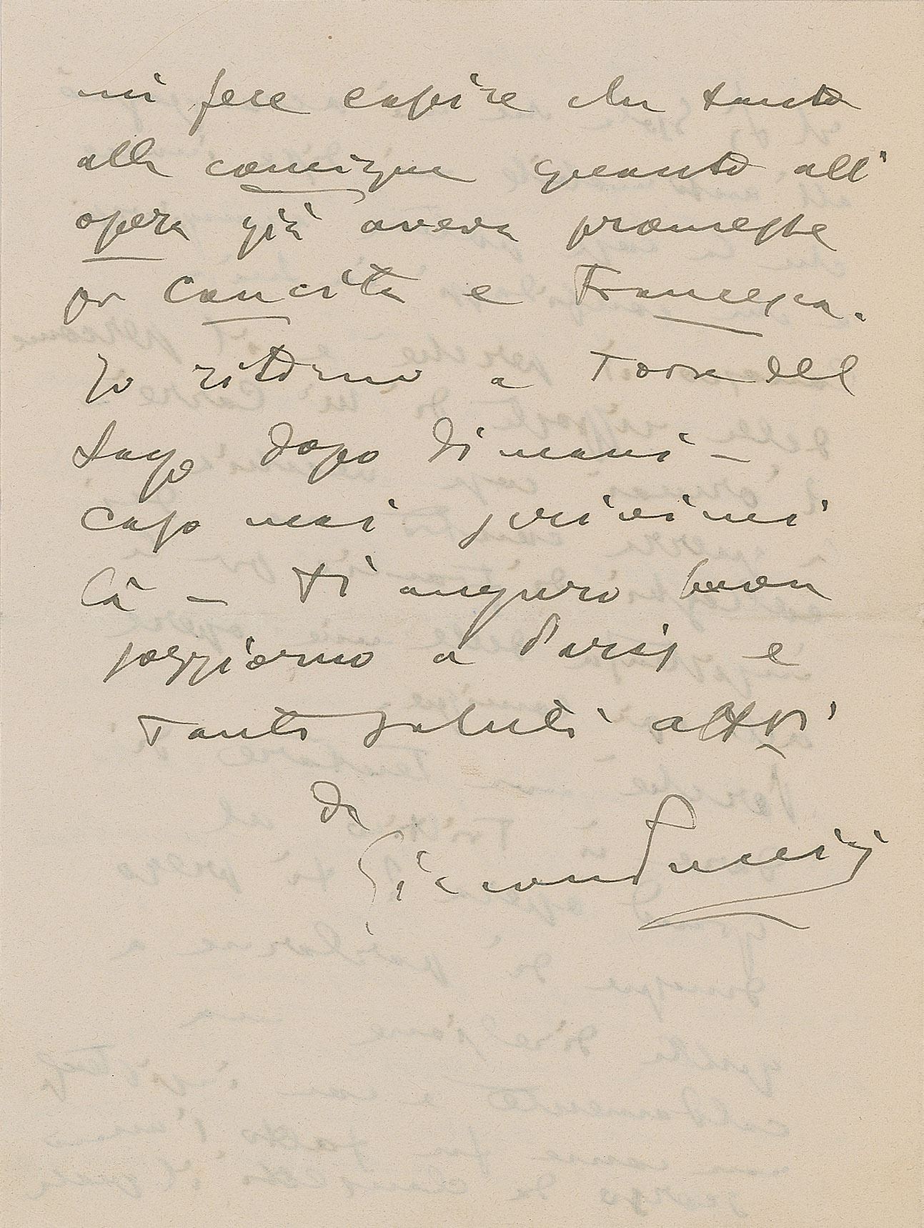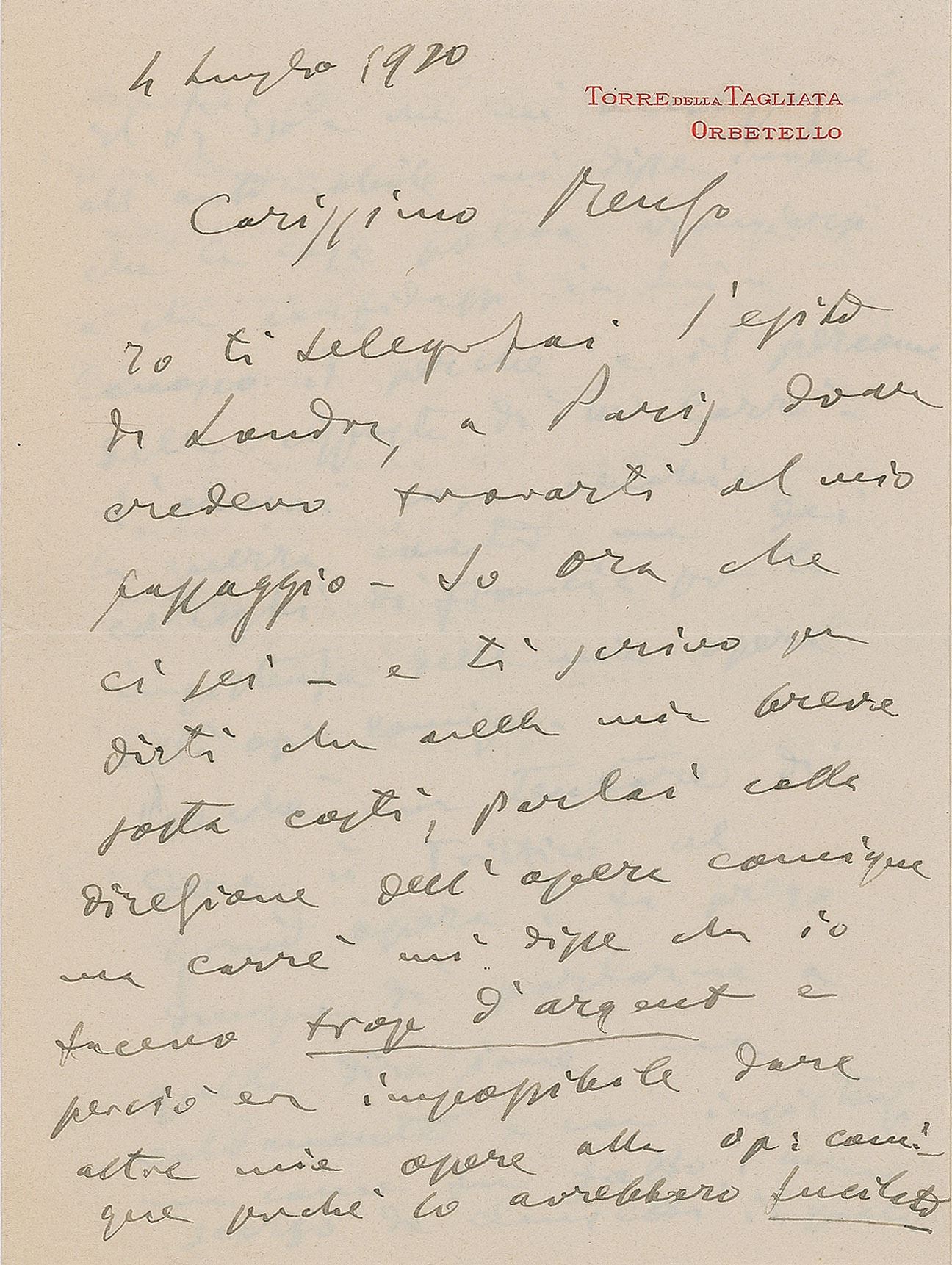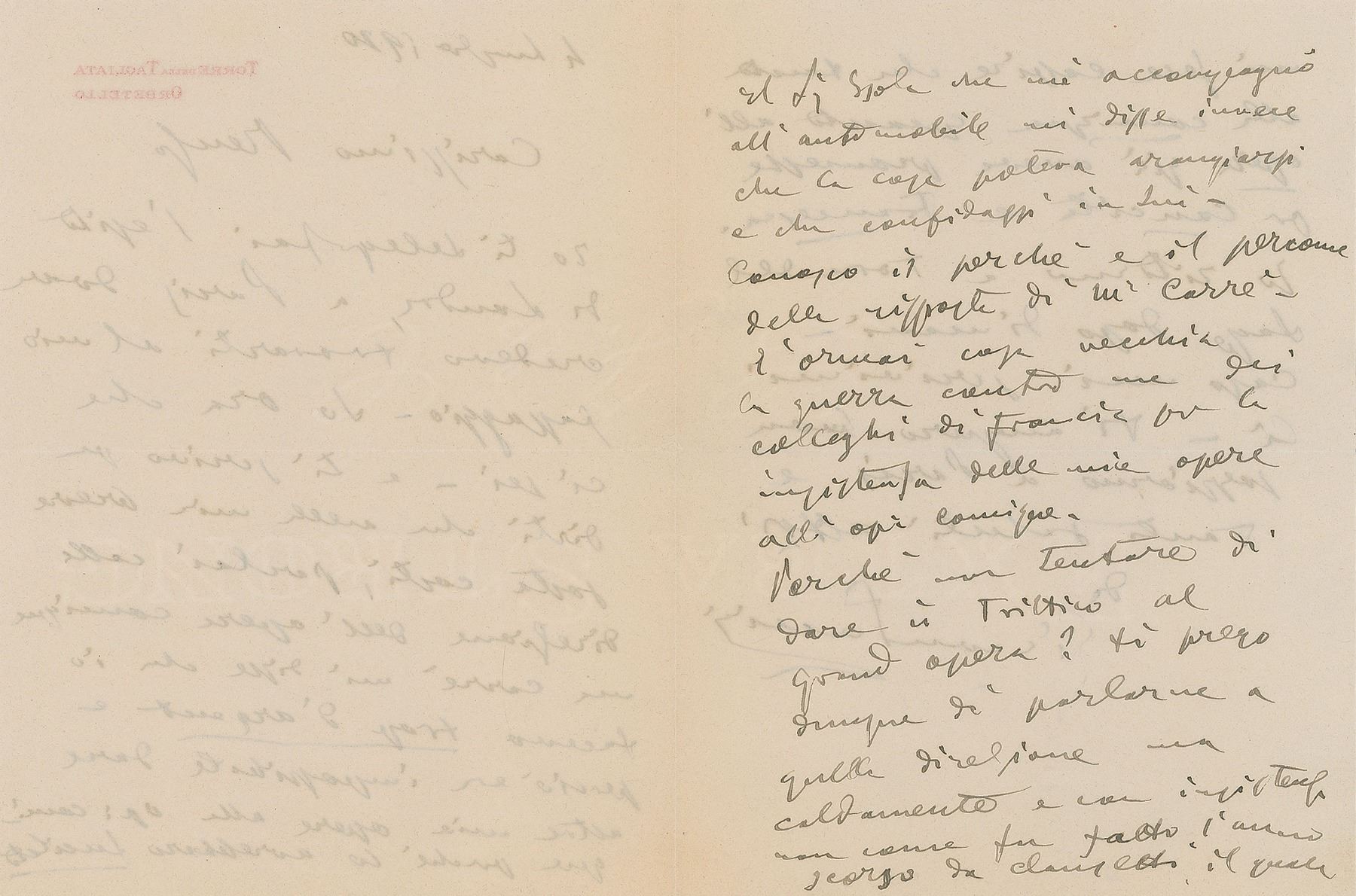 ALS in Italian, three pages on two adjoining sheets, 5.25 x 7, Orbetello letterhead, July 4, 1920. Letter to "Renzo," in full (translated): "I cabled you my departure from London in Paris, where I expected to find you, on my route. I now know what is up, and I am writing to you to tell you that during my short stay there, I spoke with the management of the Opera Comique; M. Carre told me that I made Trop d'Argent and thus it was impossible to give more of my operas at the Op: Com:, because they would have him shot. Signor Esola who accompanied me to the car, said to me on the contrary that things could be arranged, and that I should trust in him. I know the whys and wherefores of M. Carre's reply—it is still the same old story, the war against me by the French colleagues, on account of the predominance of my works at the Op: Comique. Why not try to give Il Trittico at the Grand Opera? I beg you to speak thus to the management, but firmly and persistently, not like Clausetti did a year ago, which makes me suspect that at the Comique as much as at the Opera, promises had already been made for 'Concita' and 'Francesca.' I return to Torre del Lago after tomorrow. Write to me there. I wish you a good trip to Paris, and all best wishes." In fine condition.