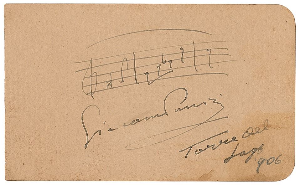 Desirable AMQS on an off-white 6 x 3.5 sheet, signed below in ink, "Giacomo Puccini, Torre del Lago, 1906." Puccini pens three bars from his iconic opera La Boheme. In fine condition, with staining to the lower right corner. Based on a story by French writer Henri Murger set in 1840s Paris, La Boheme was Puccini's first major success—making him rich and famous—and arguably his greatest work. After its 1896 debut in Turin, the piece was quickly adopted into the international repertory. Puccini lived and worked in a villa in the seaside town of Torre del Lago, which is today the host of the annual Festival Puccini.