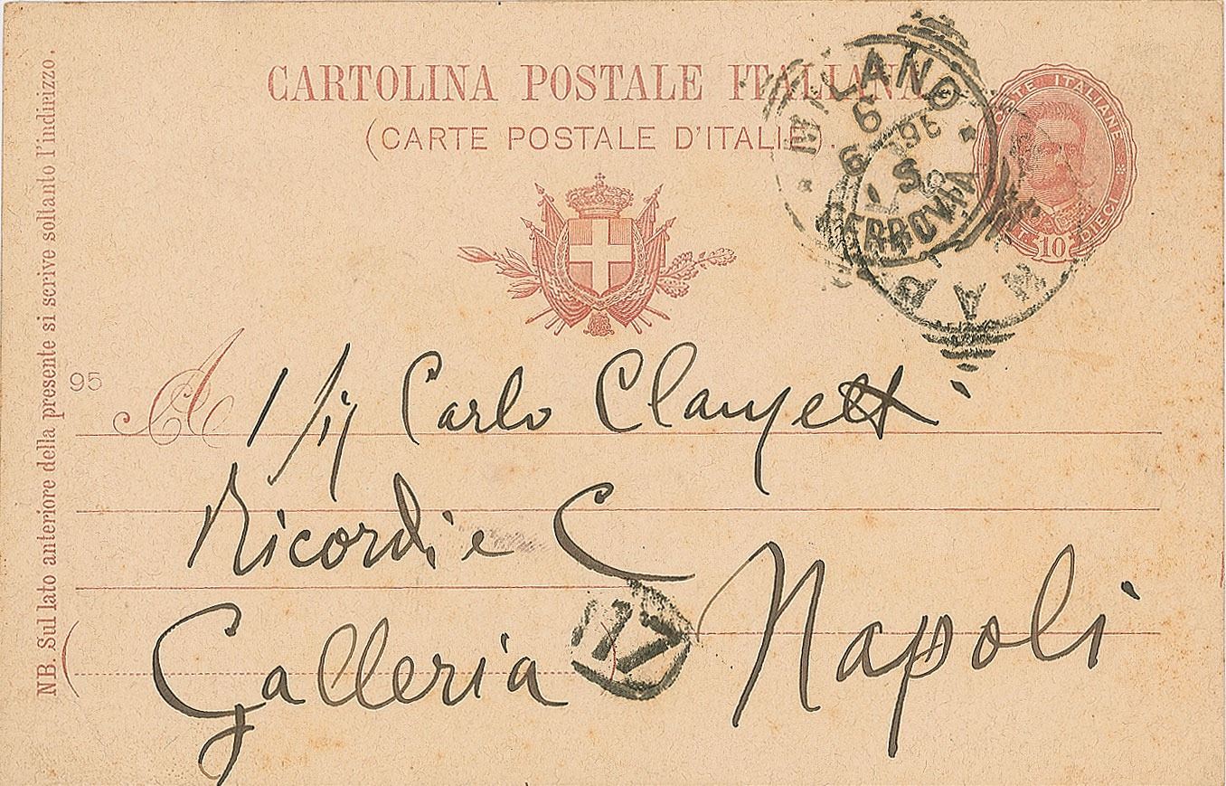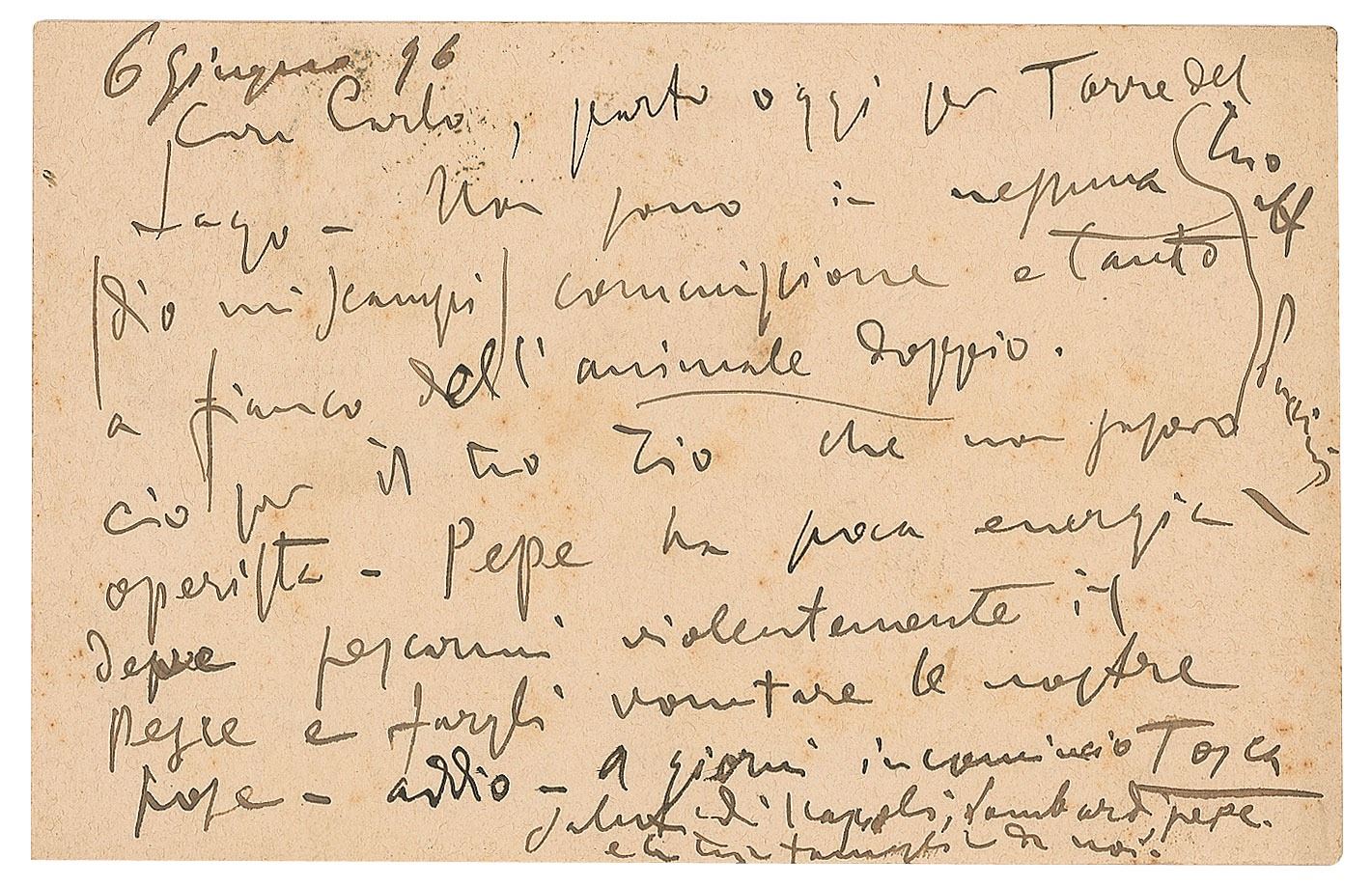 ALS, signed "Puccini" in the cramped right margin, one page on a 5.5 x 3.5 postcard, June 6, 1896. Letter to composer Carlo Clausetti of the Ricordi music publishing firm in Naples. Puccini announces his departure for Torre del Lago. He is without obligation, Dio mi scampi [God forbid] to me, and could very well be with the "double animal" [dell'animale doppio]. He adds that he did not know that Clausetti's uncle was a composer of operas. In a few days he will start Tosca [A giorni incomincio Tosca]. In fine condition, with scattered light foxing.