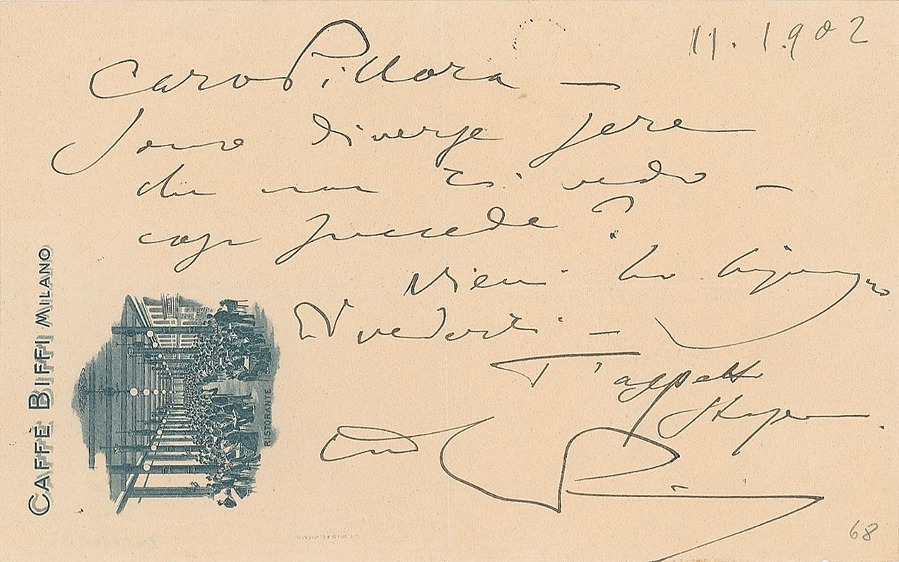 Brief ALS in Italian, one page, 8.5 x 5.25, Caffe Biffi Milano letterhead, January 11, 1902. Puccini writes to Pillora, inquiring as to why he did not see her on Thursday. In fine condition.