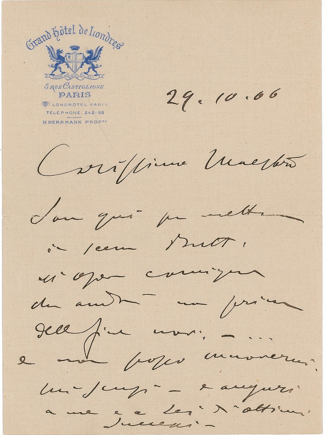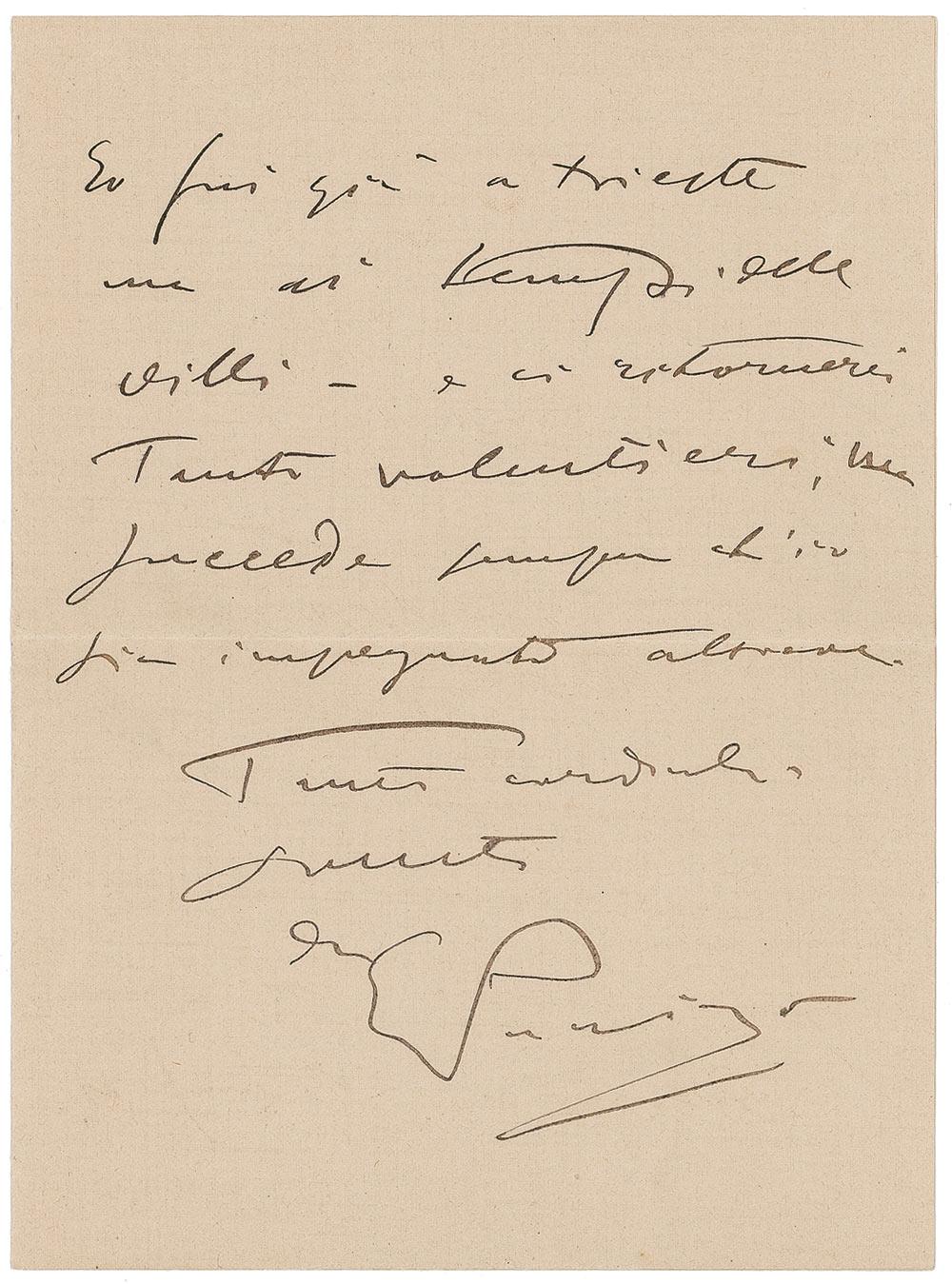 ALS in Italian, signed “Puccini,” two pages on two adjoining sheets, 5 x 7, Grand Hotel de Londres, Paris letterhead, October 29, 1906. Letter to an unidentified maestro. In part (translated): “I’m here to stage Butt.…it won’t be ready before the end of November…and I can’t leave. I’m sorry—and I wish the greatest success to me and you. I was in Trieste…and I’d go back with pleasure, but I’m always busy elsewhere.” In fine condition, with uniform mild toning to pages and a central horizontal fold. A fine association between the composer and one of his best known works, which is now a staple of operatic repertory.