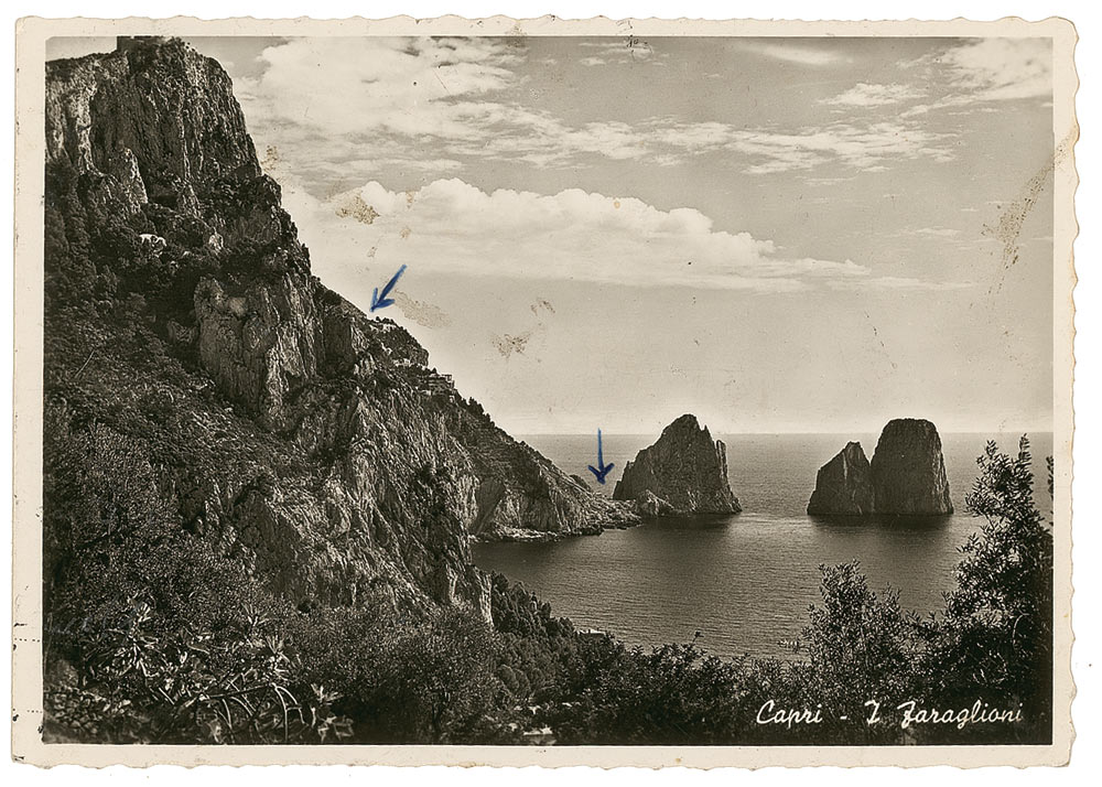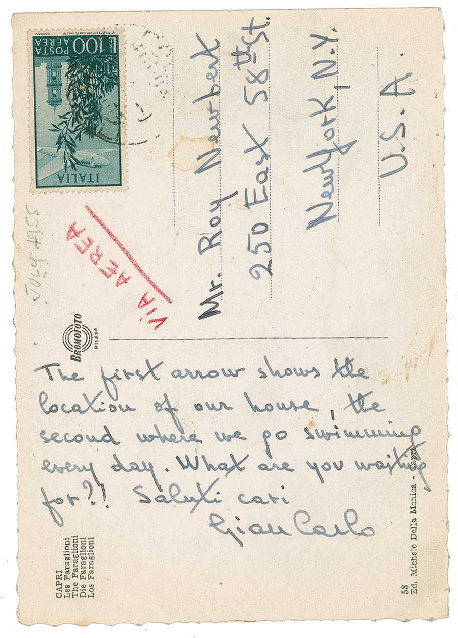 Two-time Pulitzer Prize–winning Italian American composer (1911–2007) best known for such popular operas as The Consul, The Saint of Bleecker Street, and Amahl and the Night Visitors. ALS signed “Gian Carlo,” on the correspondence side of a 6 x 4.25 deckle-edge postcard of Capri, no date. Short letter to Roy Newbert. In full: “The first arrow shows the location of our house, the second where we go swimming every day. What are you waiting for?” Scattered toning and soiling, and surface marks and impressions to image side, otherwise fine condition.