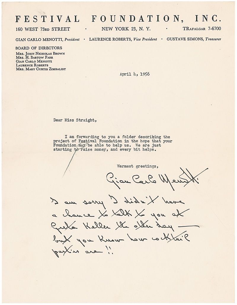 Two-time Pulitzer Prize–winning Italian American composer (1911–2007) best known for such popular operas as The Consul, The Saint of Bleecker Street, and Amahl and the Night Visitors. TLS, one page, 8.5 x 11, Festival Foundation, Inc. letterhead, April 4, 1956. Brief note to Miss Straight. In part: “I am forwarding to you a folder describing the project of Festival Foundation.” Under his signature, Menotti adds a handwritten postscript which reads, “I am sorry I didn’t have a chance to talk to you at Greta Keller the other day—but you know how cocktail parties are!!” In fine condition, some light creasing and wrinkling.