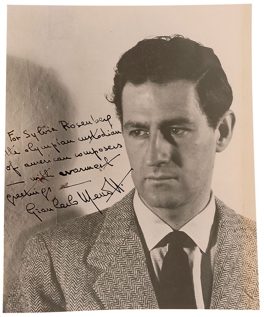 Two-time Pulitzer Prize–winning Italian American composer (1911–2007) best known for such popular operas as The Consul, The Saint of Bleecker Street, and Amahl and the Night Visitors. In 1977, he founded the Spoleto Festival USA in Charleston, South Carolina, is one of the world's major performing arts festivals. Vintage glossy 7.25 x 8.75 photo, signed and inscribed in fountain pen “For Sylvia Rosenberg, the Olympian custodian of American composers—with warmest greetings—Gian Carlo Menotti.” In very good condition, with trimmed edges, scattered creases and surface marks, and toning along right edge.