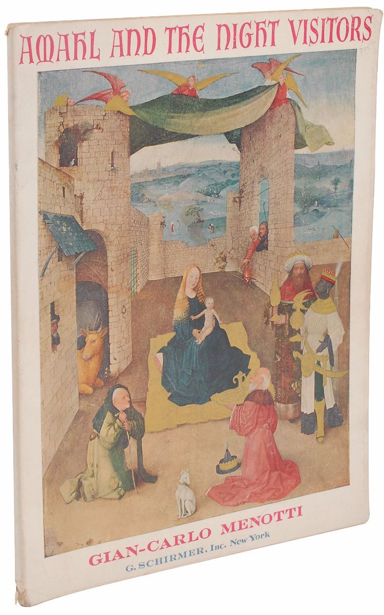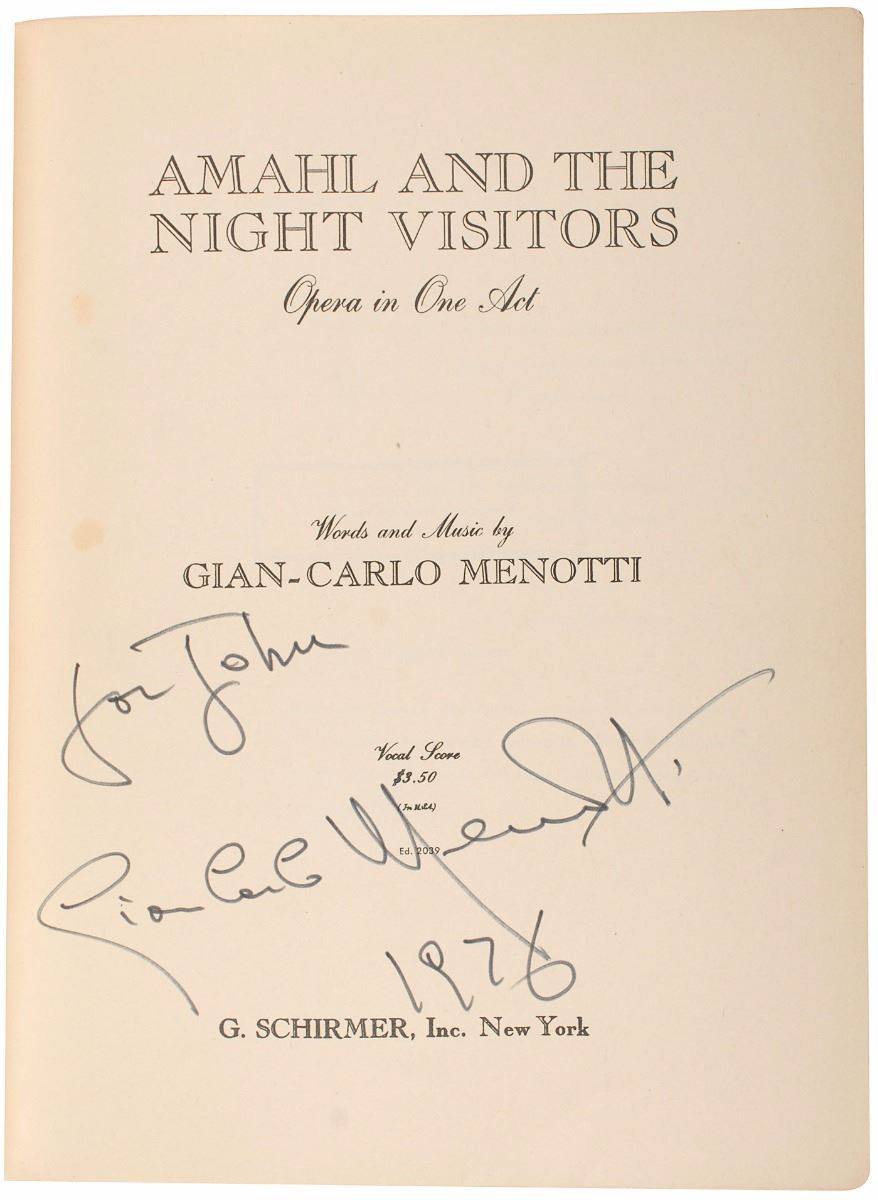 Signed book: Amahl and the Night Visitors. Later printing. NY: G. Schirmer, 1952. Softcover, 9 x 12, 65 pages. Signed and inscribed on the title page in black felt tip, “For John, Gian Carlo Menotti, 1976.” In very good condition, with scattered creases and staining to covers (primarily to the back cover) and chipping to spine edges.