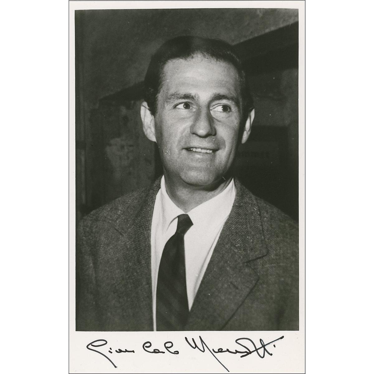 Two-time Pulitzer Prize–winning American composer (1911–2007) best known for such popular operas as ‘The Consul,’ ‘The Saint of Bleecker Street,’ and ‘Amahl and the Night Visitors.’ Matte-finish 3.5 x 5.5 head-and-shoulders photo, signed in the lower border in black ink. In very fine condition.