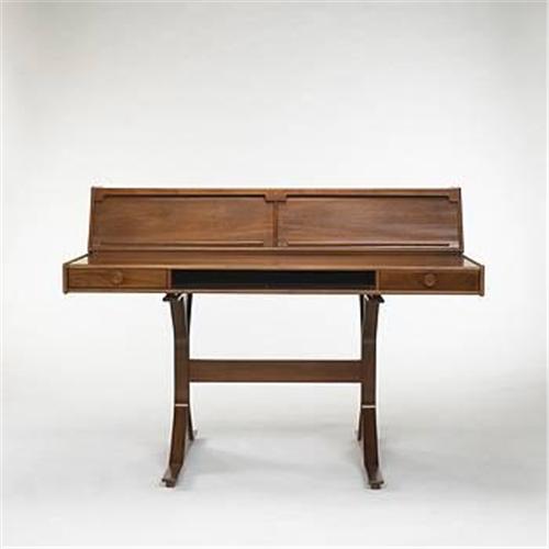 Gianfranco Frattini desk, model #530 Bernini Italy, 1957 Italian walnut 51"w x 32"d x 37"h This rationalist form combines precise structural design with the craftsmanship of Italian cabinetmakers. Two tambour doors on top element conceal three small drawers and five letter dividers. <BR>Literature: Repertorio 1950-1980, Gramigna, pg. 111
