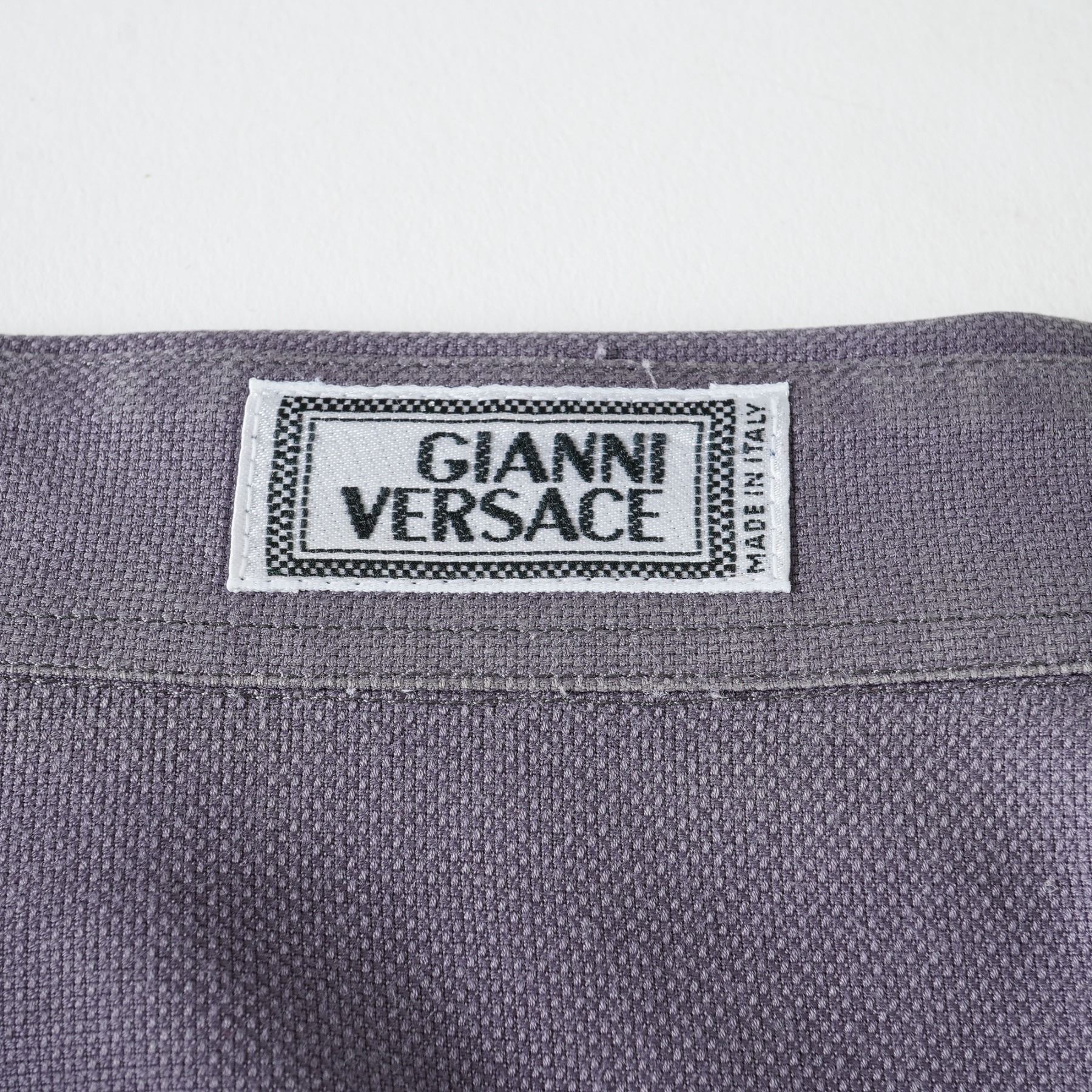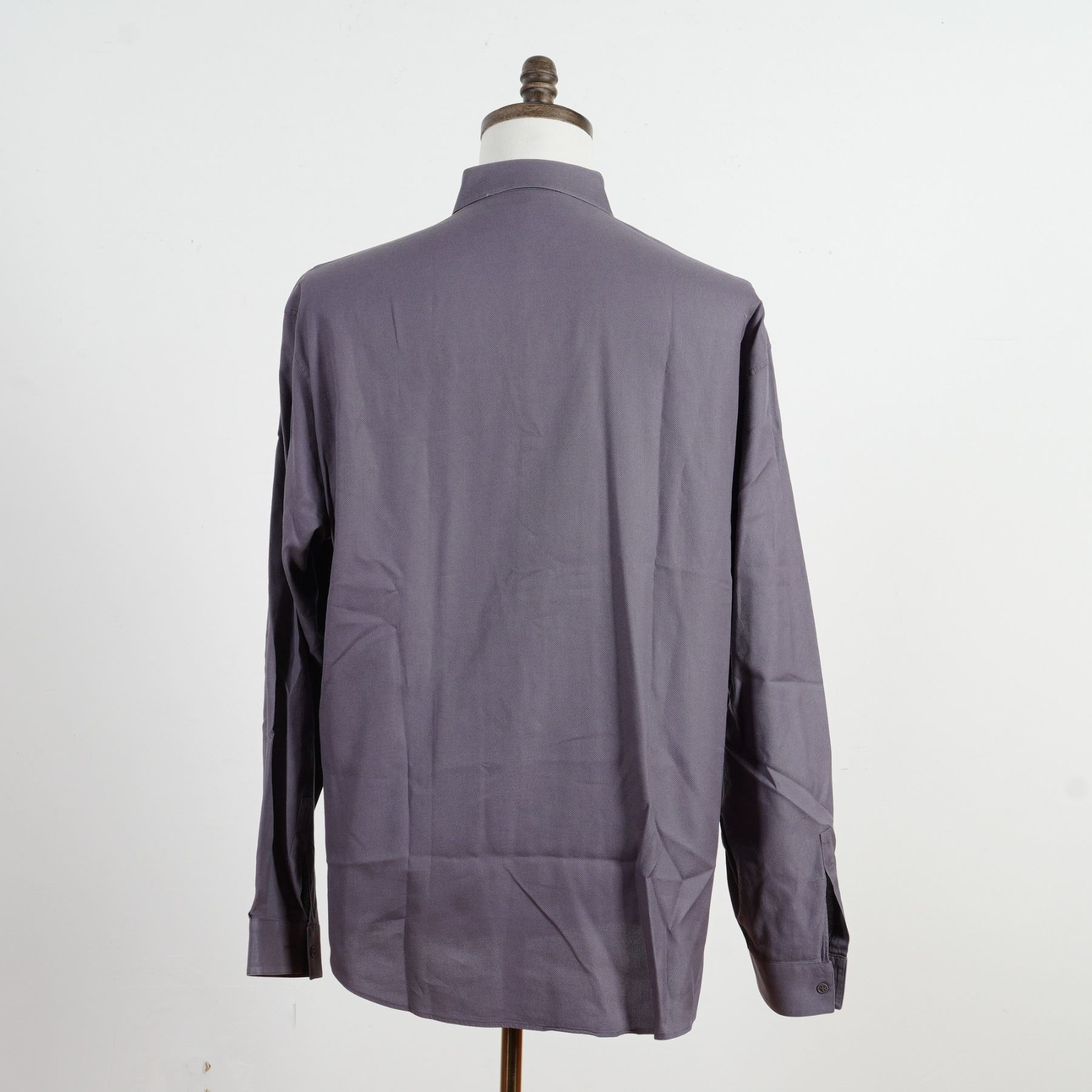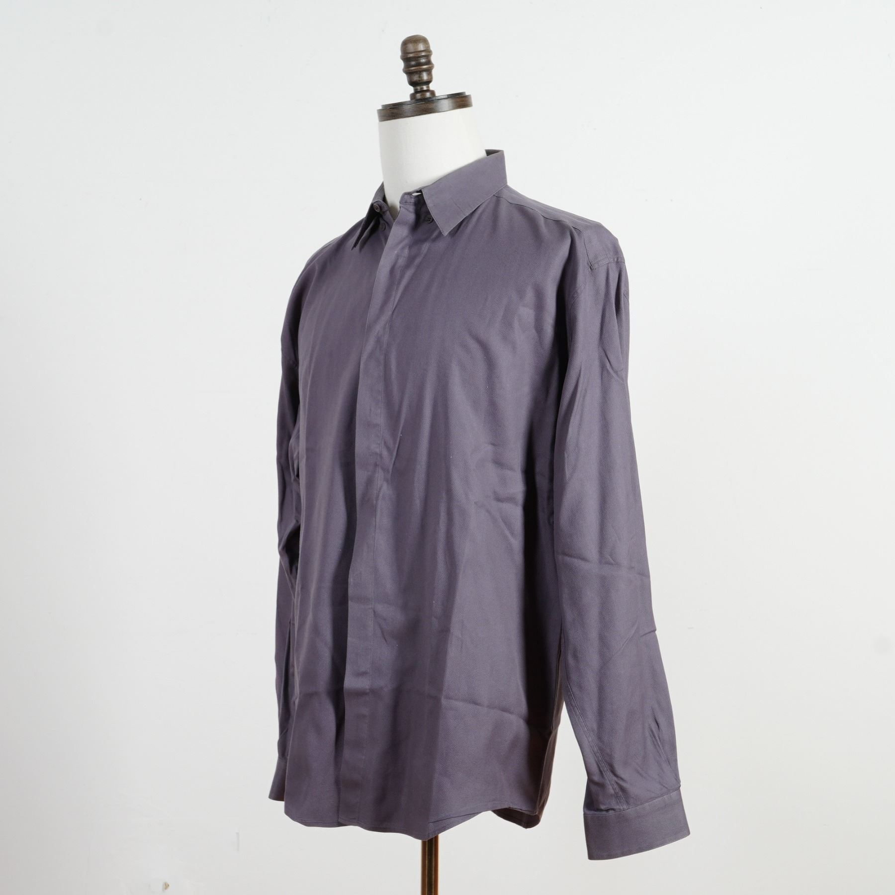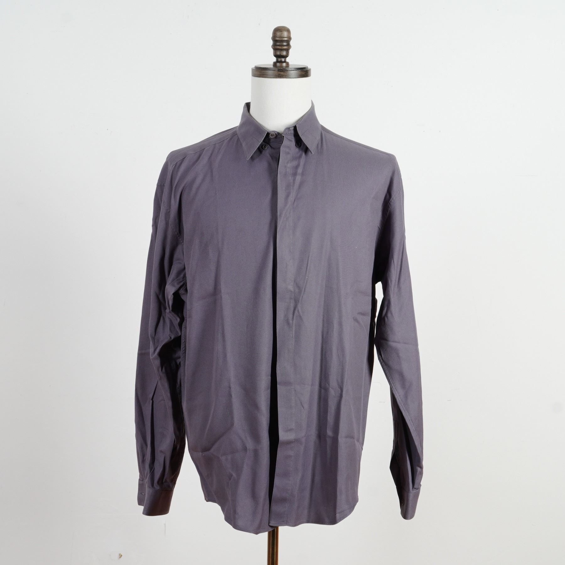 A sophisticated expression of Gianni Versace's refined tailoring, this Italian-made shirt comes in an elegant slate purple hue, a distinctive blend of grey and muted violet that exudes modern luxury. Expertly crafted from a finely textured cotton fabric, it features a concealed button placket, sharp point collar, and long sleeves with buttoned cuffs for a sleek, structured silhouette. The understated tone and precise construction make this piece effortlessly versatile. Size 50.