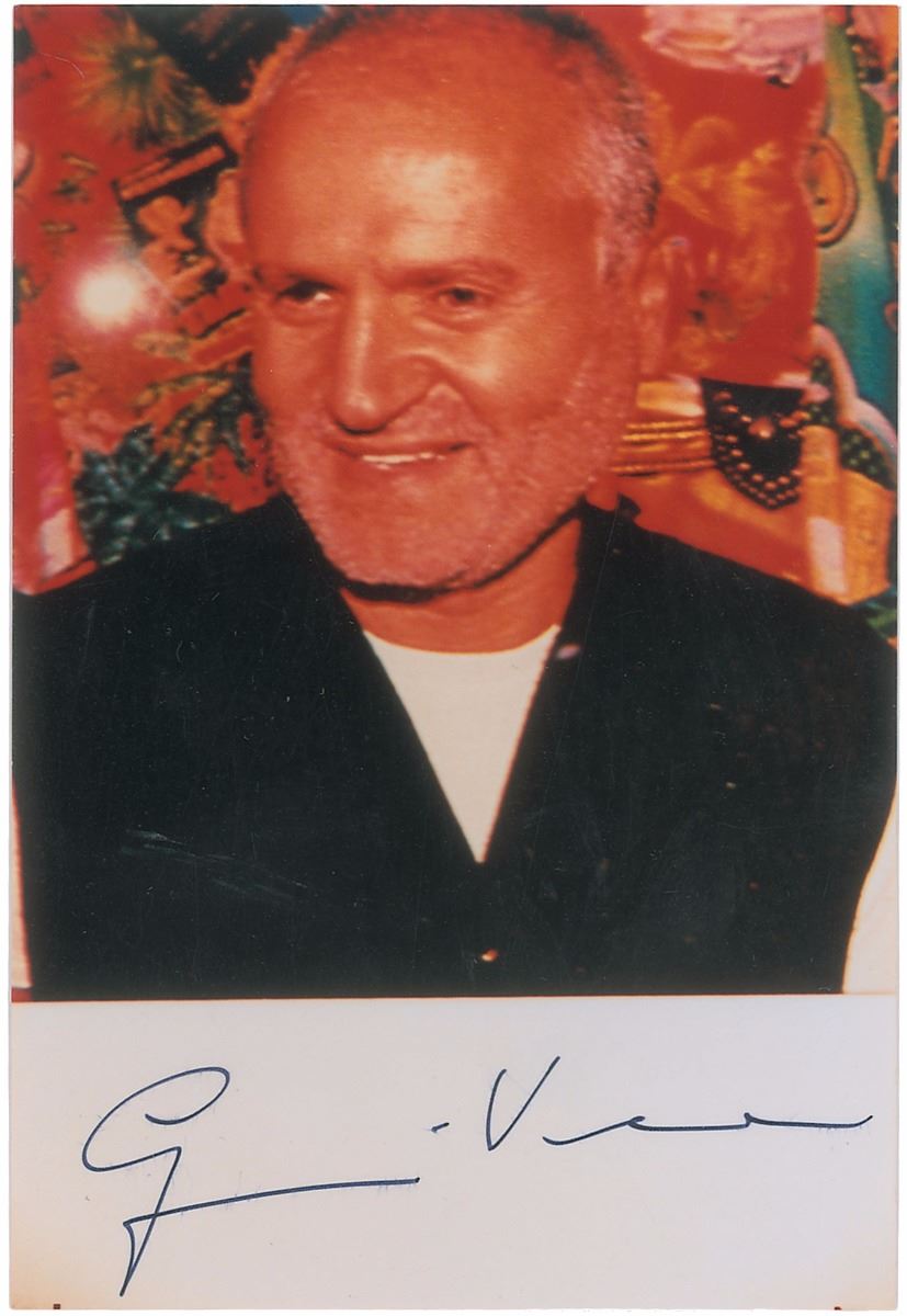 Color satin-finish 3 x 4.25 photo of Versace, signed in the lower border in black ink. In fine condition, with trivial soiling and evenly trimmed edges.