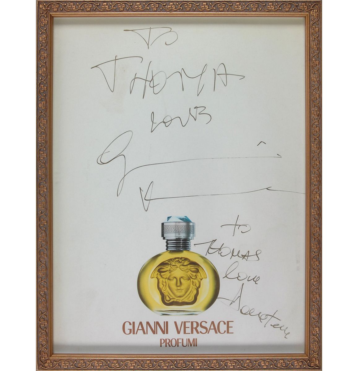 Color advertisement for Versace’s perfume, 9 x 12, signed and inscribed in black felt tip, “To Thomas, love, Gianni Versace,” and “To Thomas, love, Donatella.” Framed to an overall size of 10.25 x 13.5. In fine condition, with some mild toning to top and right edge.