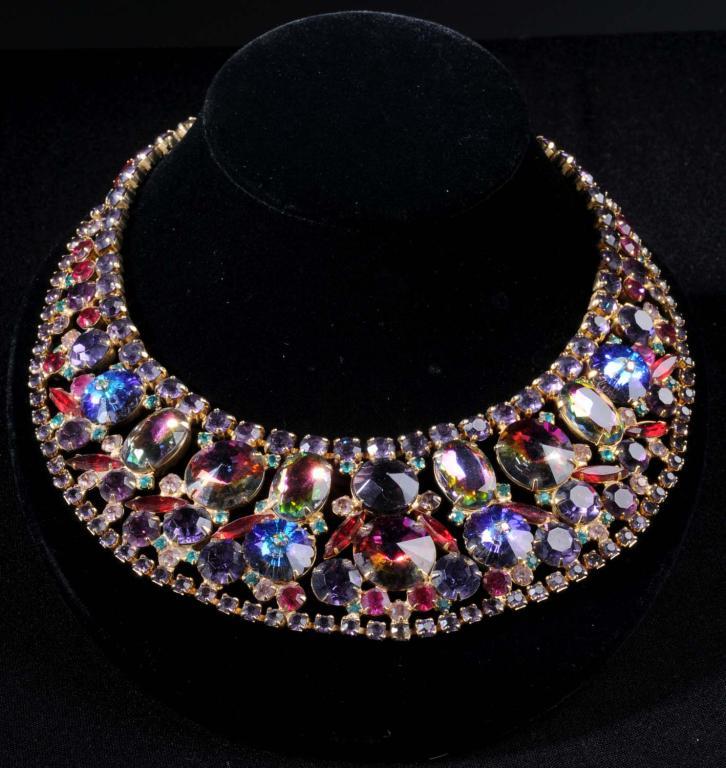Description Multi-colored rhinestones, unsigned, and exquisite. Purple rhinestones outline multi-color shaped stones. Condition (Excellent). Size 15" - 19" adjustable length.