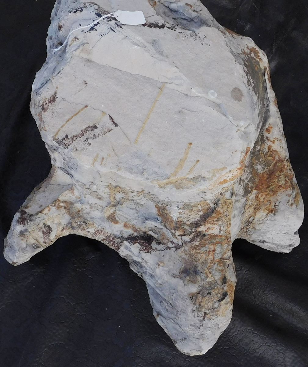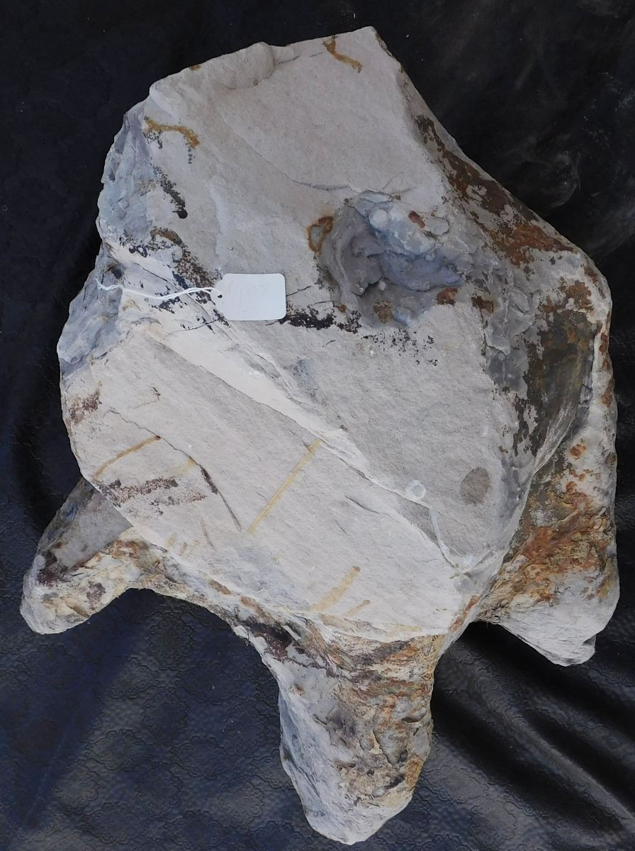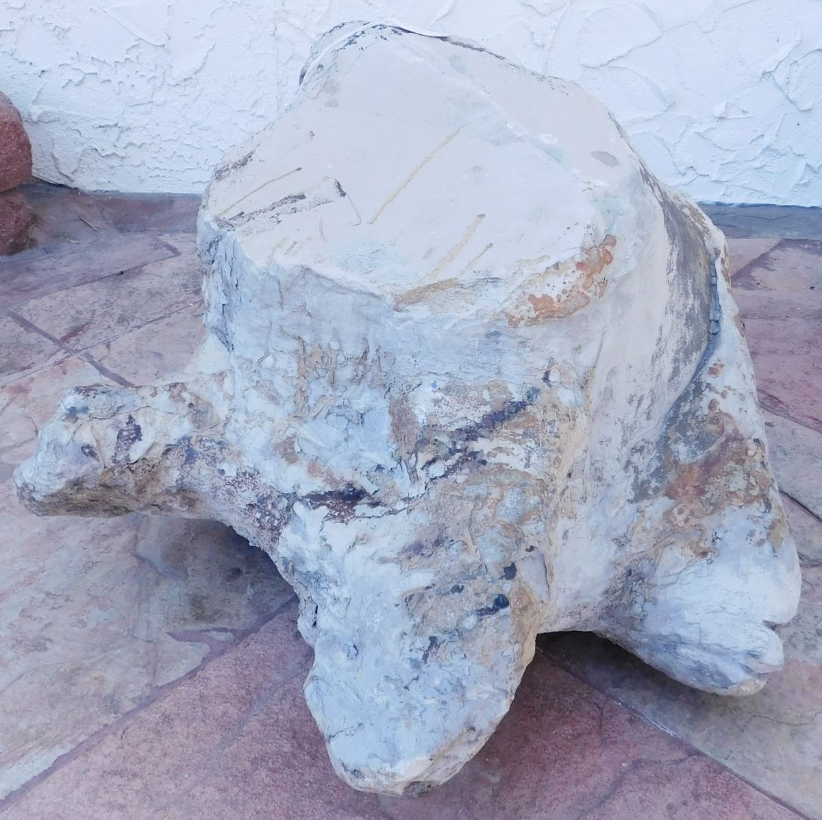 Giant Dinosaur Footprint, circa 65 million years old. Made of fossil and possibly sandstone, this large item is 24" x 19" x 15". Found in a coal mine in Utah. The dinosaur stepped in mud, the footprint filled up and contents turned to stone. Weighs about 200 pounds. Will not ship. Condition: Good, see images. Shipping: No shipping service will be provided for this item. Buyer or registered agent must pick up item.