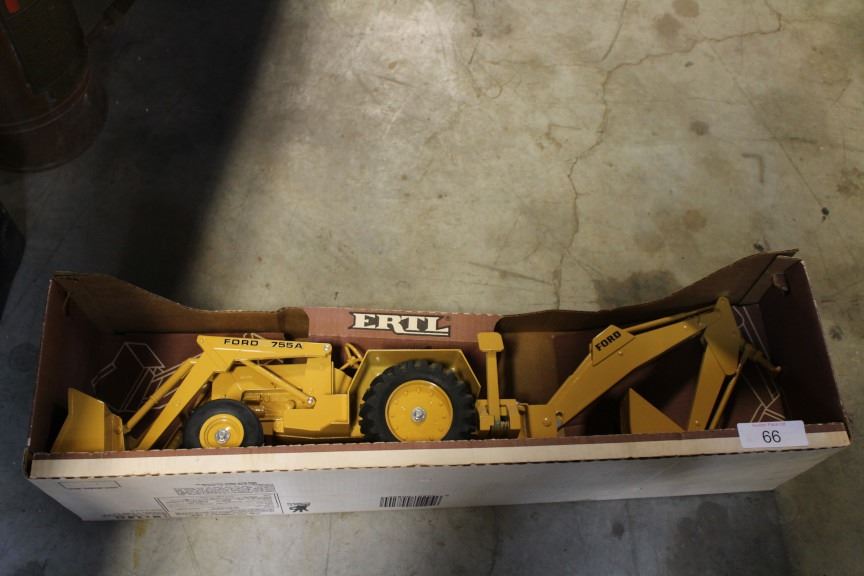 Die Cast Model Front End Steering: knee-action wide front wheel movement Endloader scoops, raises, lowers, dumps and locks into position, Backhoe moves in, out, up and down, pivots 180 and digs trenches