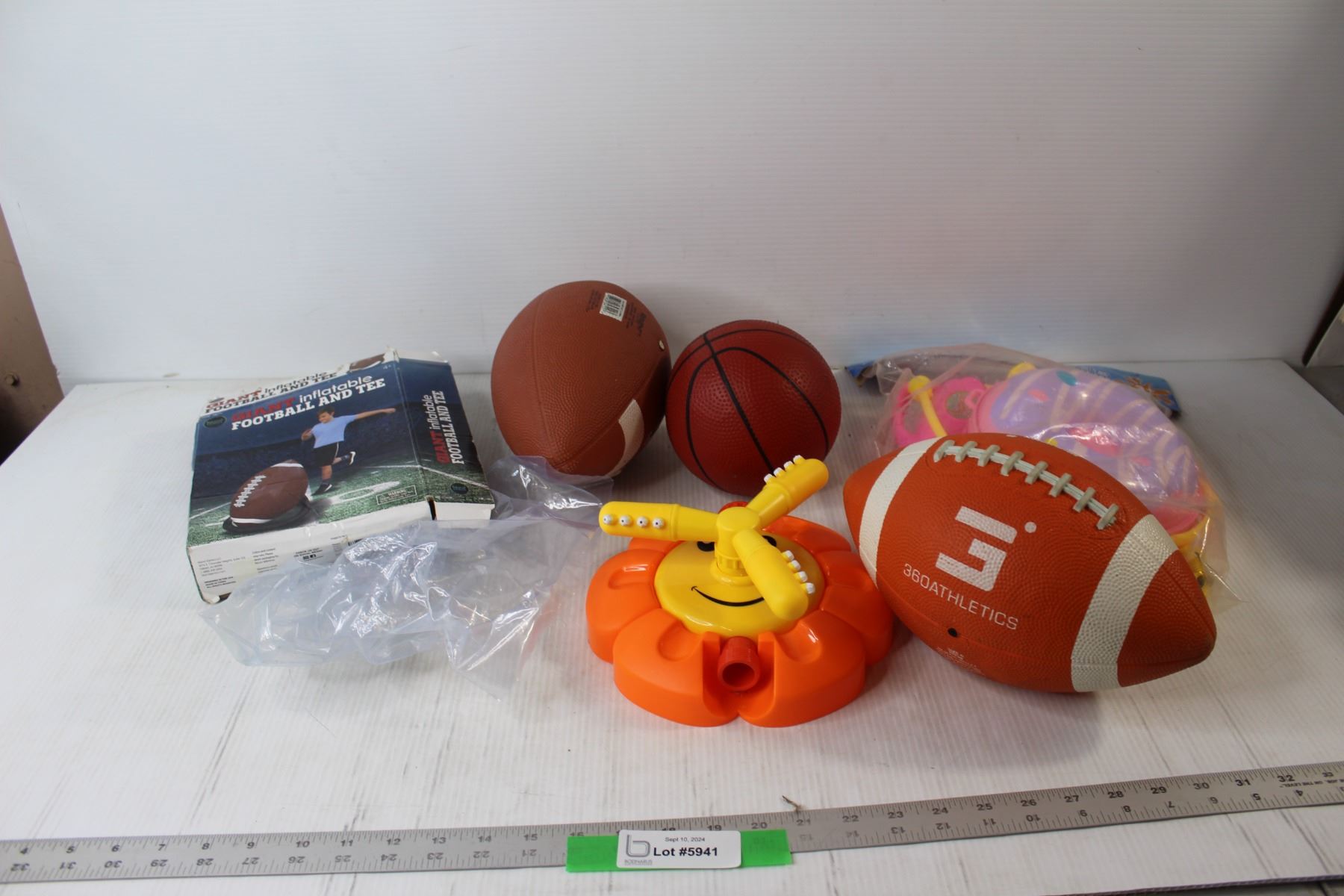 Giant Inflatable Football and Tee, (2) Footballs, Mini Basketball, Water Gun Backpack, Kids Sprinkle