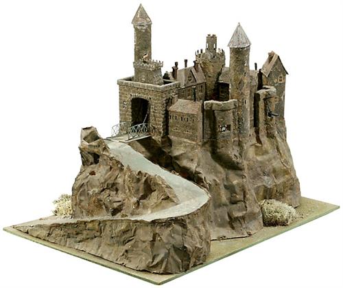 Giant Knight Castle, c. 1880 River Rhine romantic castle, made true to scale custom, with all fine details: drawbridge, fortified tower, houses, battlements, embrasures with cannons etc. Plastered tin, on solid ground plate (39 x 27 in.), highest tower: 29 1/2 in. - An impressive exhibition and collector's piece!<Br>