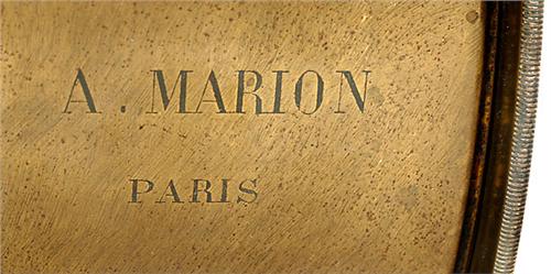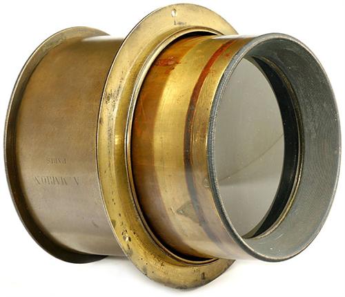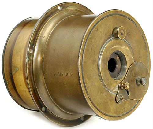 Giant Lens for Daguerreotype Camera by Marion, Paris, c. 1845 A. Marion, Paris, similar to the Giroux lens. Single plano-concave lens. Three stops on a revolving circular disc with rack-and-pinion drive. Hinged lens cap. Front diameter 6 2/3 in., diameter of lens board ring 7 9/10 in., height 7 1/2 in. From the Permutt collection. Fits to a giant sliding box camera.<Br>