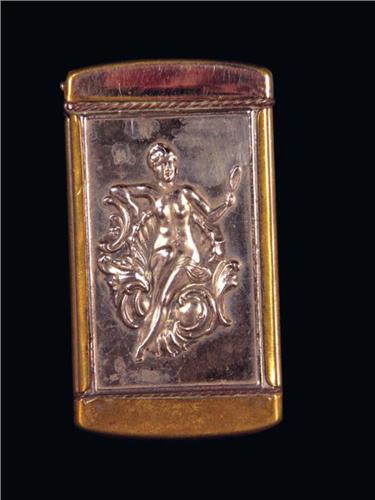 Extremely Rare Advertising Match Safe for the Giant Powder Company, San Francisco, CA. Nickel plated brass with nude. Loss of nickel otherwise excellent condition. 1 1/2 X 2 3/4 inches.