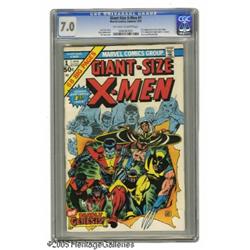 <B>Giant-Size X-Men #1 (Marvel, 1975) CGC FN/VF 7.0 Off-white to white pages.</B></I> This is the first appearance of the new X-Men, and features the first appearance of Storm, Nightcrawler, Colossus, and Thunderbird. It is also the second full appearance of Wolverine (after <B>Incredible Hulk</B></I> #181). This copy is stunning with brilliant colors and a tight spine. Square-bound Marvels are notoriously hard to find in high grade because the cover was glued to the spine. Overstreet 2004 FN 6.0 value = $207; VF 8.0 value = $587. CGC census 1/05: 154 in 7.0, 1132 higher.
