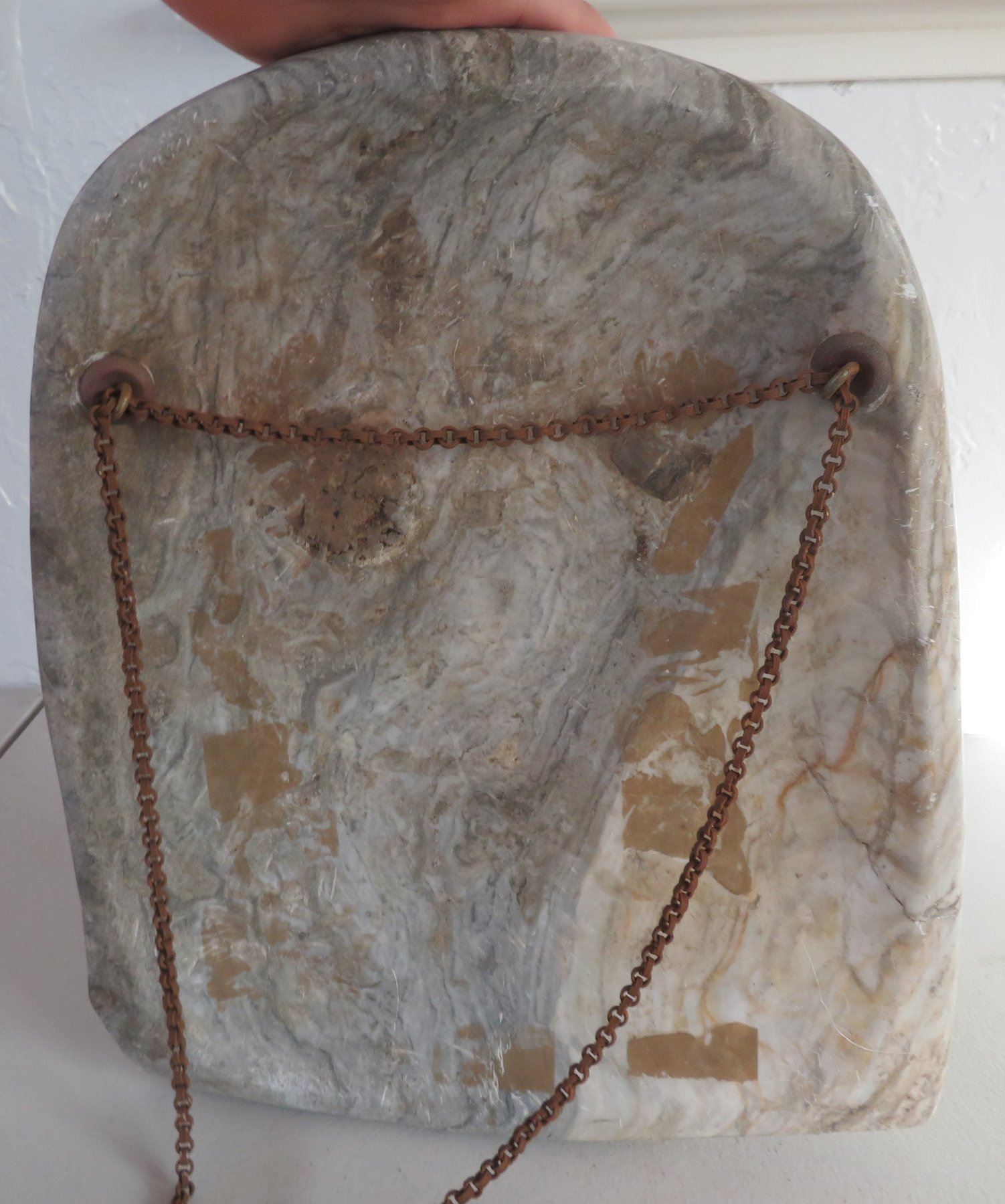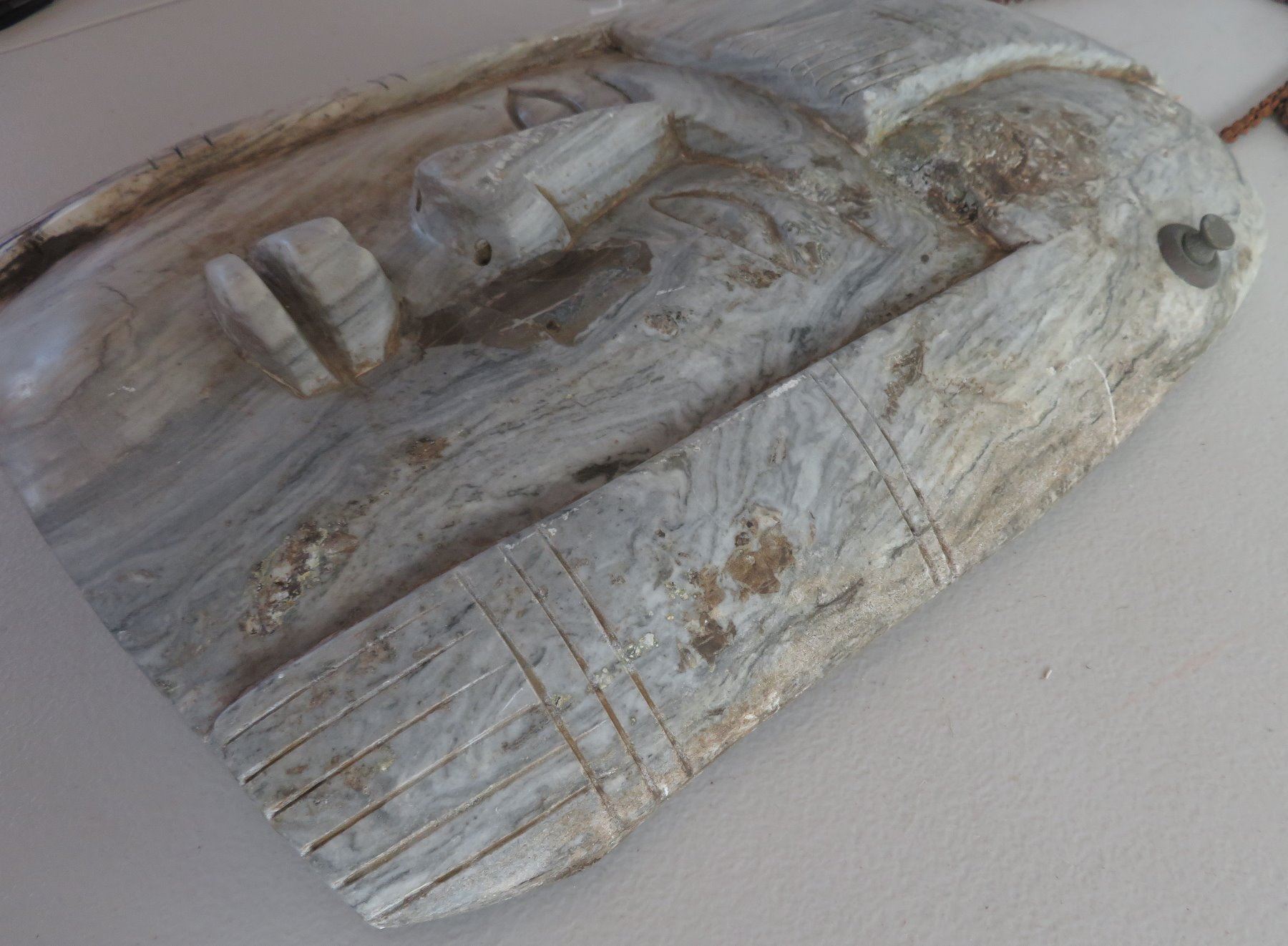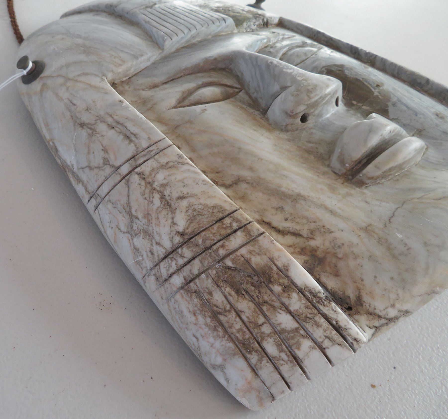 Giant Spanish Colonial Stone Mask, c. 1800s. Made of stone, possibly marble, the item measures 16 1/2" x 13" x 3". Central Mexico. Patina on chain. Condition: Some wear and chips, see images. Shipping: $80.00 USA estimate only, due to heavy weight, w/insurance and signature.