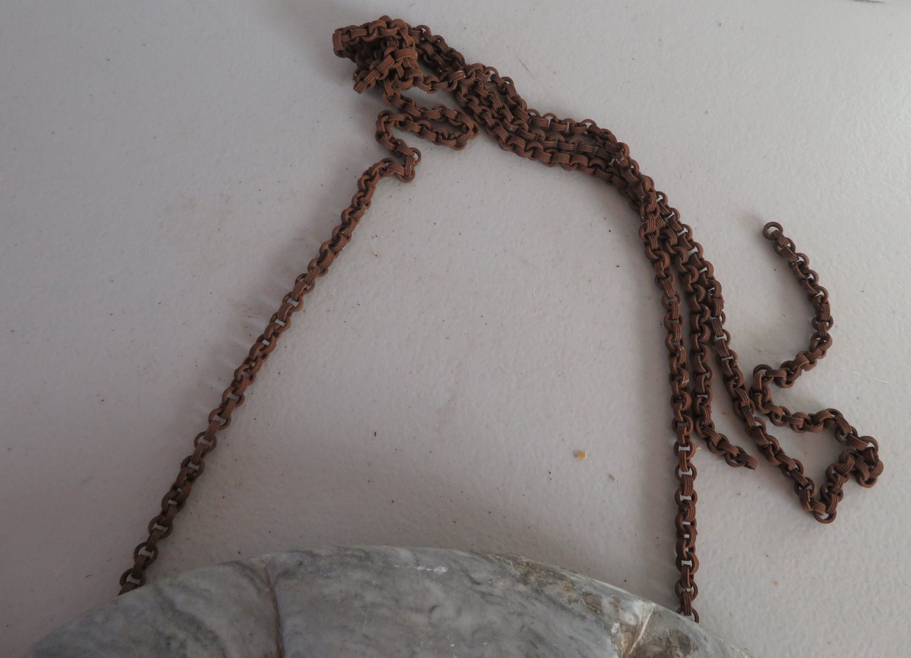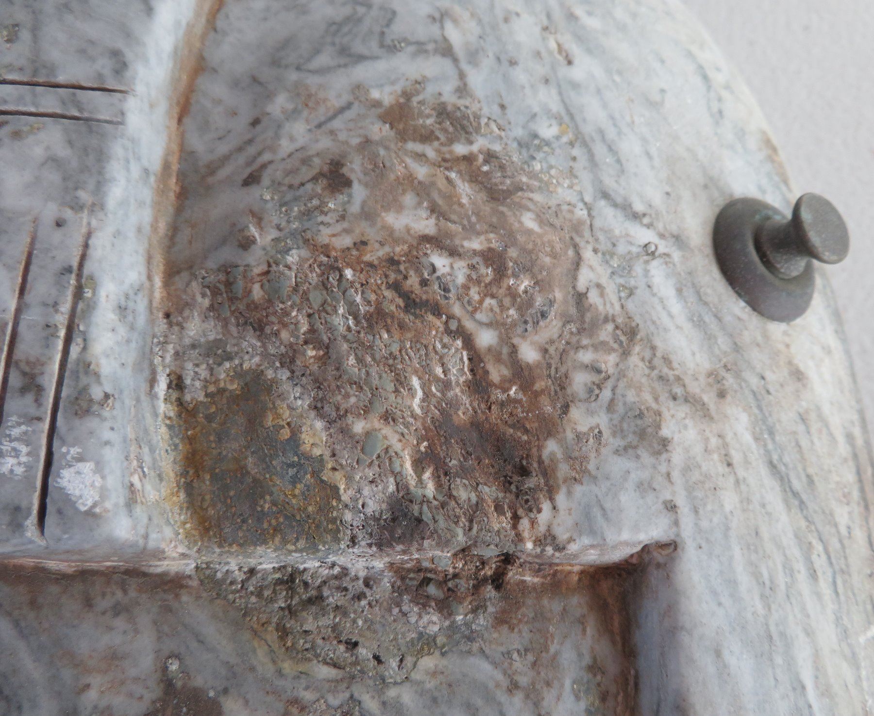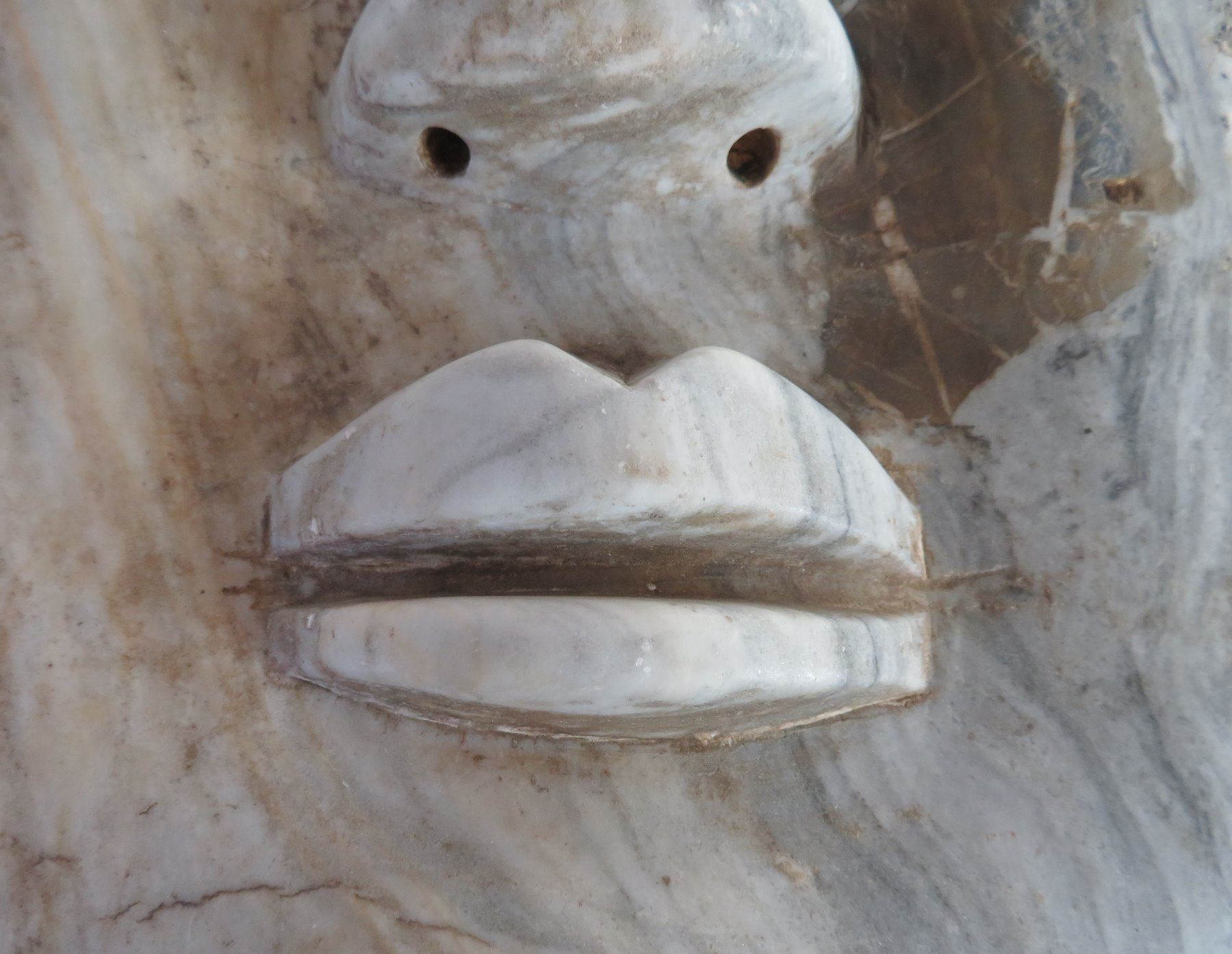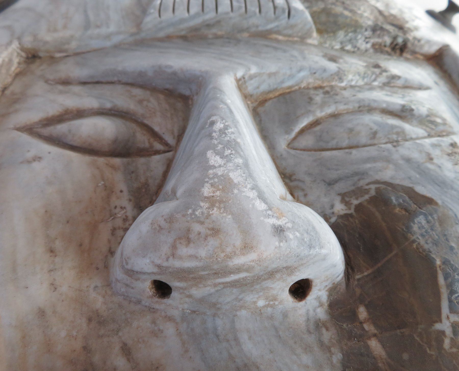 Giant Spanish Colonial Stone Mask, c. 1800s. Made of stone, possibly marble, the item measures 16 1/2" x 13" x 3". Central Mexico. Patina on chain. Condition: Some wear and chips, see images. Shipping: $80.00 USA estimate only, due to heavy weight, w/insurance and signature.