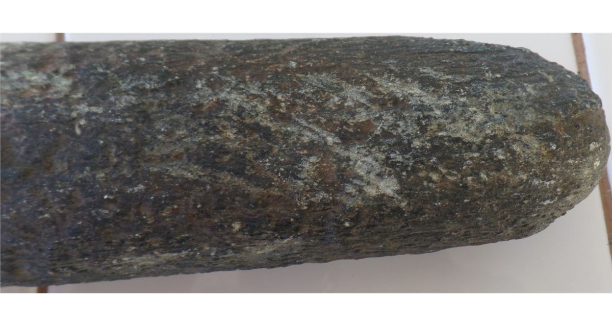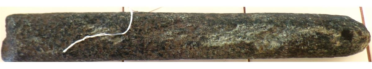 This basalt Giant stone celt is approximately 1500 years old. It is made from basalt and from Northern California. This giant celt measures 17 x 2 x 1 inch. There are chips on bit and scratches on blade. Shipping: $35.00