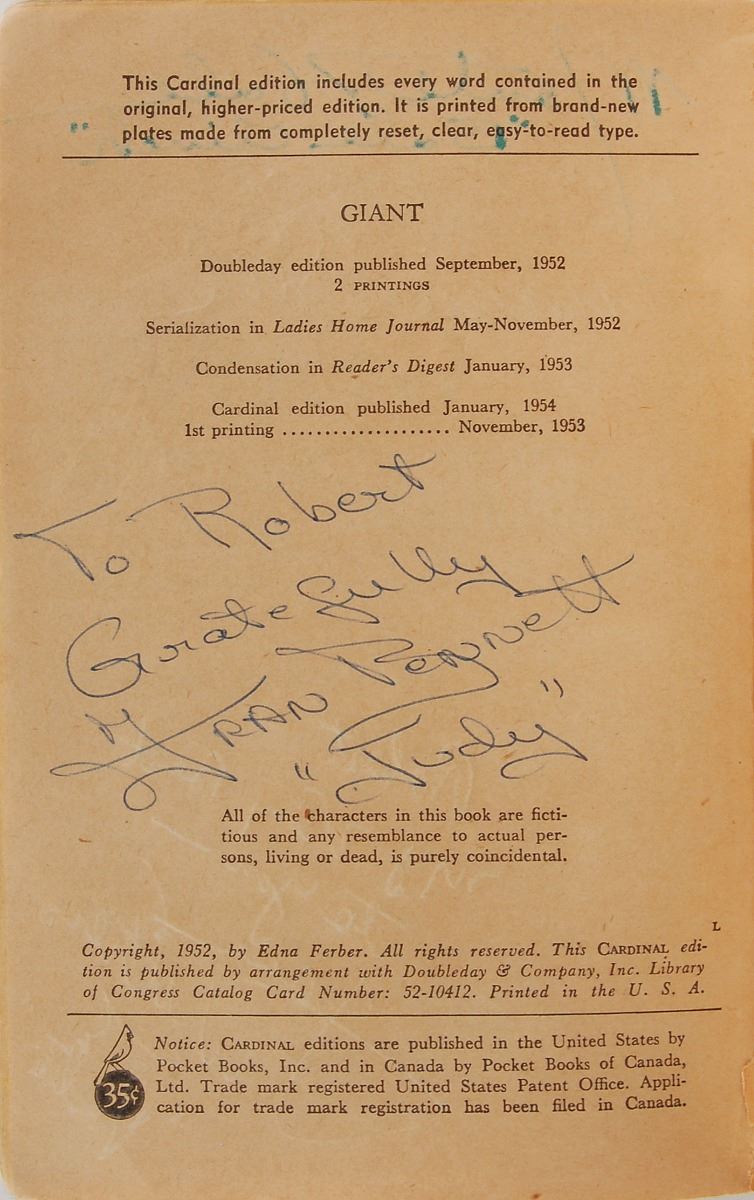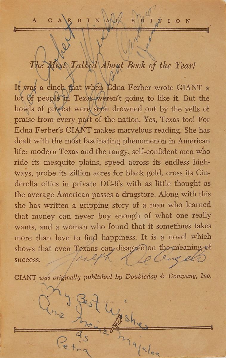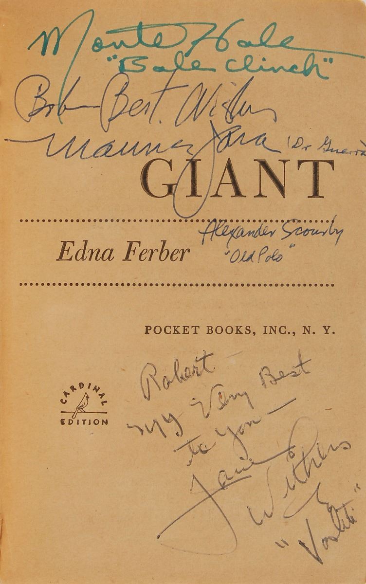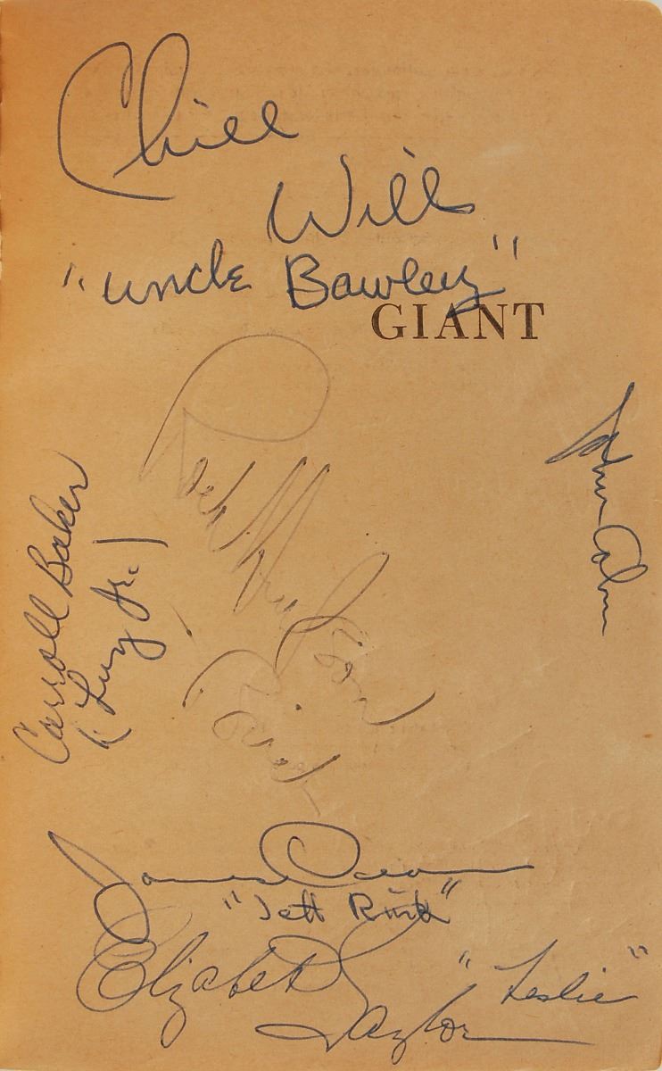 Signed book: Giant. Later printing (Cardinal Edition). NY: Pocket Books, Inc., 1953. Paperback, 4.25 x 6.5, 389 pages. Signed and inscribed on the front and back of the first four opening pages, as well as on the inside front and back covers, in various colored ballpoint by twenty-six cast and crew members of the 1956 film Giant, with the majority of actors adding their character names. The half-title page bears signatures of the three main stars: “James Dean, ‘Jett Rink,’” “Elizabeth Taylor, ‘Leslie,’” and “Rock Hudson—Bick.” Other signers include: George Stevens, Fred Guiol, Carroll Baker, Jane Withers, Chill Wills, Mercedes McCambridge, Earl Holliman, Robert Nichols, Alexander Scourby, Fran Bennett, Charles Watts, Elsa Cardenas, Monte Hale, Mary Ann Edwards, Victor Millan, Pilar Del Rey, Maurice Jara, Ana Maria Majaica, Felipe Turich, Valley Keene, and three others. Also included is a blue ballpoint signature, “Dennis Hooper, (‘Jordy Jr.’),” an off-white 4.25 x 4 slip. In very good to fine condition, with wear to the covers and toning to interior pages, not adversely affecting the remarkable assemblage of signatures. Consignor notes that the original recipient worked on the set of the movie Giant as a bus boy during production in Marfa, Texas. Inspired by Edna Ferber’s classic 1952 novel, Giant was considered a huge success by both crowds and critics alike, amassing a total of ten Oscar nominations with Director George Stevens taking home the film’s only prize. Giant has since become best remembered as James Dean’s final performance in a leading role; the actor died at the age of twenty-four, only ten days before the film’s New York premiere.