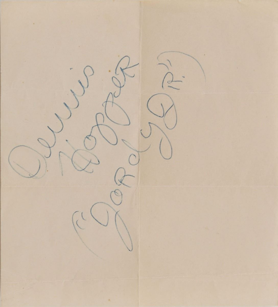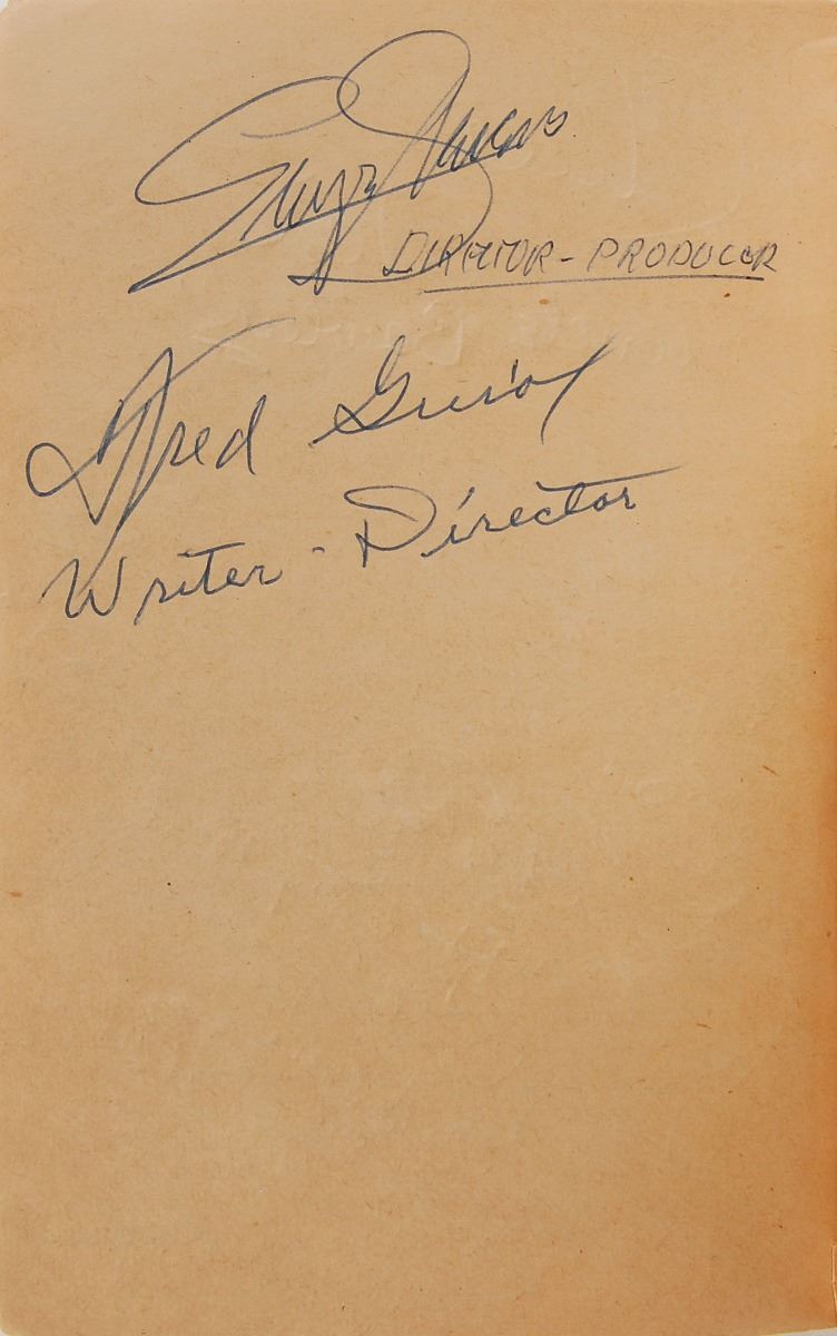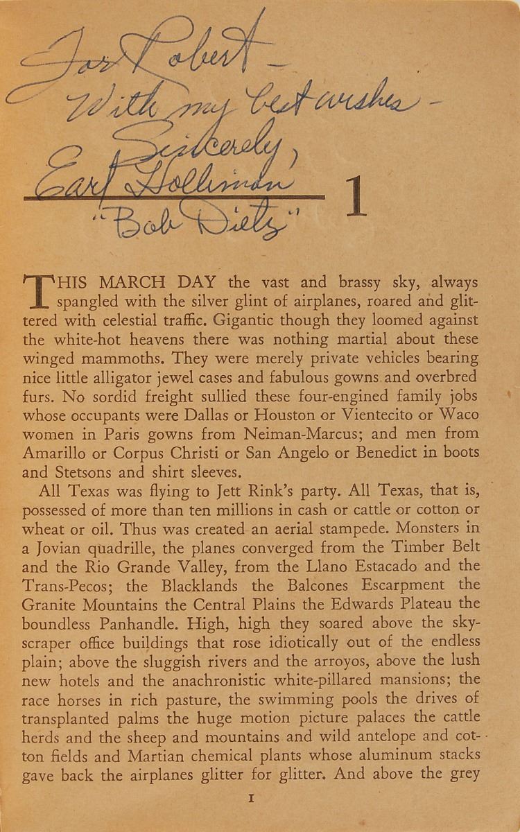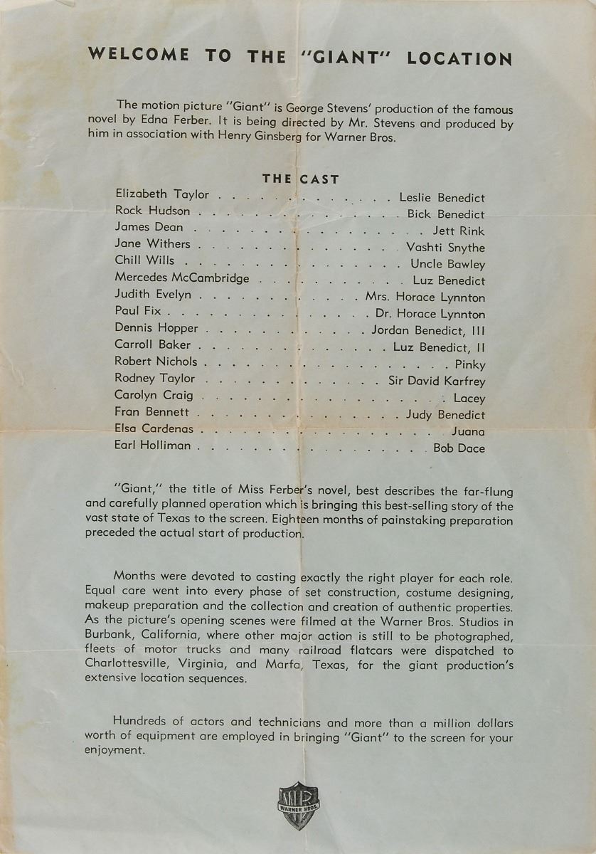 Signed book: Giant. Later printing (Cardinal Edition). NY: Pocket Books, Inc., 1953. Paperback, 4.25 x 6.5, 389 pages. Signed and inscribed on the front and back of the first four opening pages, as well as on the inside front and back covers, in various colored ballpoint by twenty-six cast and crew members of the 1956 film Giant, with the majority of actors adding their character names. The half-title page bears signatures of the three main stars: “James Dean, ‘Jett Rink,’” “Elizabeth Taylor, ‘Leslie,’” and “Rock Hudson—Bick.” Other signers include: George Stevens, Fred Guiol, Carroll Baker, Jane Withers, Chill Wills, Mercedes McCambridge, Earl Holliman, Robert Nichols, Alexander Scourby, Fran Bennett, Charles Watts, Elsa Cardenas, Monte Hale, Mary Ann Edwards, Victor Millan, Pilar Del Rey, Maurice Jara, Ana Maria Majaica, Felipe Turich, Valley Keene, and three others. Also included is a blue ballpoint signature, “Dennis Hooper, (‘Jordy Jr.’),” an off-white 4.25 x 4 slip. In very good to fine condition, with wear to the covers and toning to interior pages, not adversely affecting the remarkable assemblage of signatures. Consignor notes that the original recipient worked on the set of the movie Giant as a bus boy during production in Marfa, Texas. Inspired by Edna Ferber’s classic 1952 novel, Giant was considered a huge success by both crowds and critics alike, amassing a total of ten Oscar nominations with Director George Stevens taking home the film’s only prize. Giant has since become best remembered as James Dean’s final performance in a leading role; the actor died at the age of twenty-four, only ten days before the film’s New York premiere.