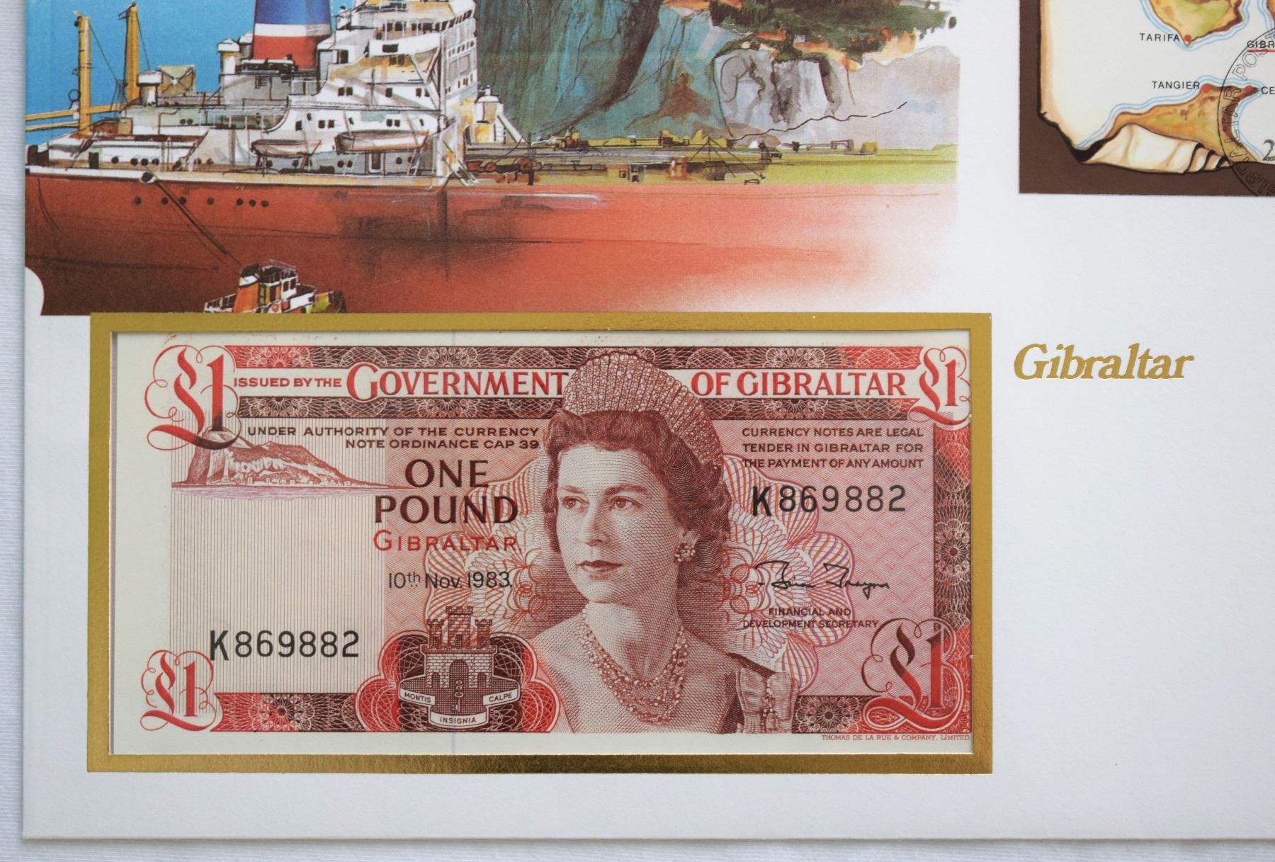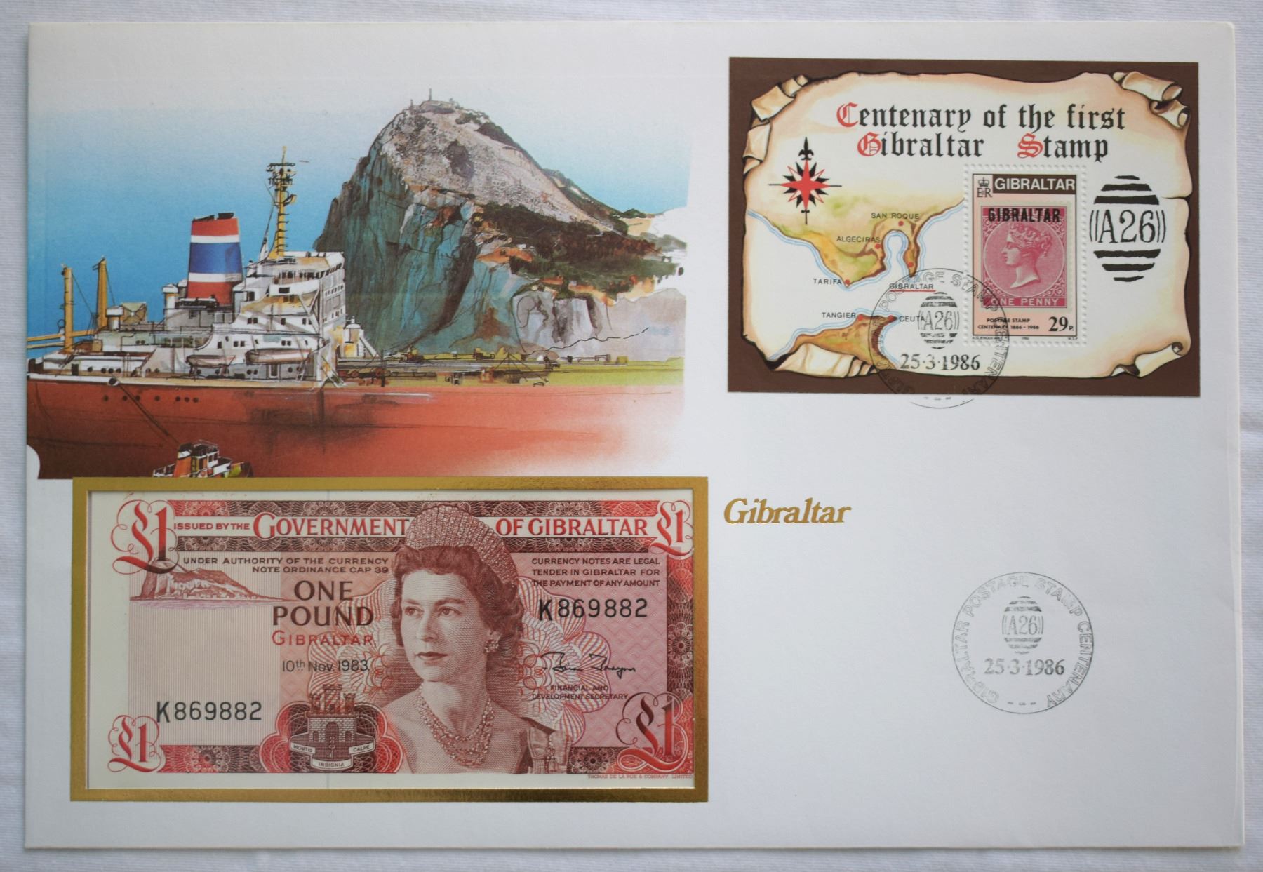 Gibraltar, £1 1983 First Day Cover German Issued, QEII Pick# 20c Nice Vignette "The Crag of Gibraltar w/ Bote" and Philatelic Souvenir Sheet, Cancelled Gibraltar Postage Centenary in 1986 Mint as Issued, Perfect.