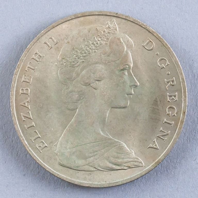 Gibraltar coin. Obverse: Second portrait of HM Queen Elizabeth II with tiara facing right. Lettering: ELIZABETH II D·G·REGINA. Reverse: Arms of Gibraltar with key dividing date and legend around. Lettering: BIGRALTAR / 1967 / ONE CROWN. Diameter: 4 cm. 28 grams.