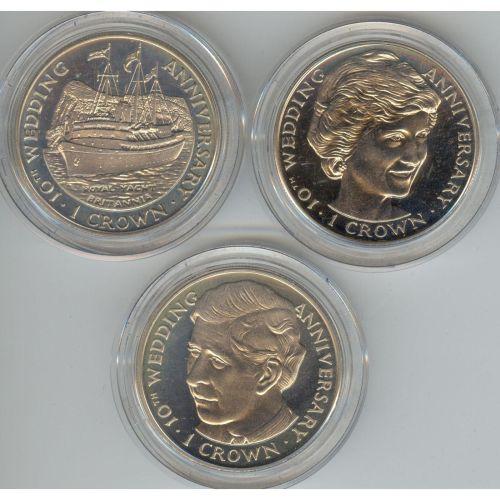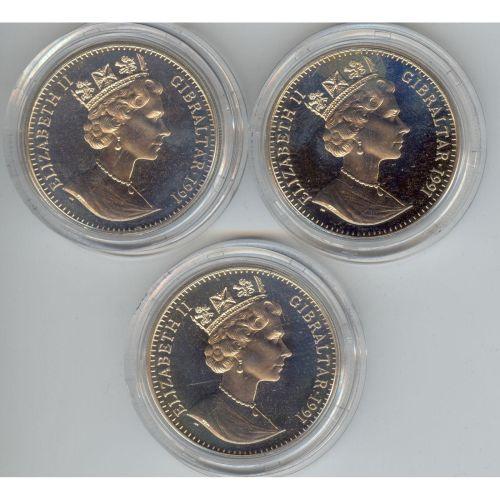 Gibraltar set of 3 Proof Coins in presentation case, coins depict Charles KM # 84a, Diana KM # 85a and a ship KM # 86a.