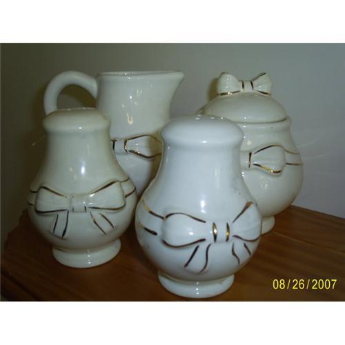 This is a cute 4pc table service made by Gibson. The salt & pepper both measure 4"Hx3"across. The sugar bowl measures 3.5"H (with lid)x4.75"W x 3.5"D. The creamer is 4.5"h x 4.85"W (with handle & spout) x 3.5"D. There is one small chip on the bottom, of the creamer, but it isn't noticable unless you turn it over. These pieces all have a bow tie design across the front, in a gold painted design. These pieces are done in a glazed white finish, but 2 of them seem to be dingy, and look to almost be an ivory color. I think they just need a good sponge, and hot soap bath, to be cleaned. The plastic stoppers are present in both salt & pepper shakers. The overall condition of these items are good, and just need cleaning.