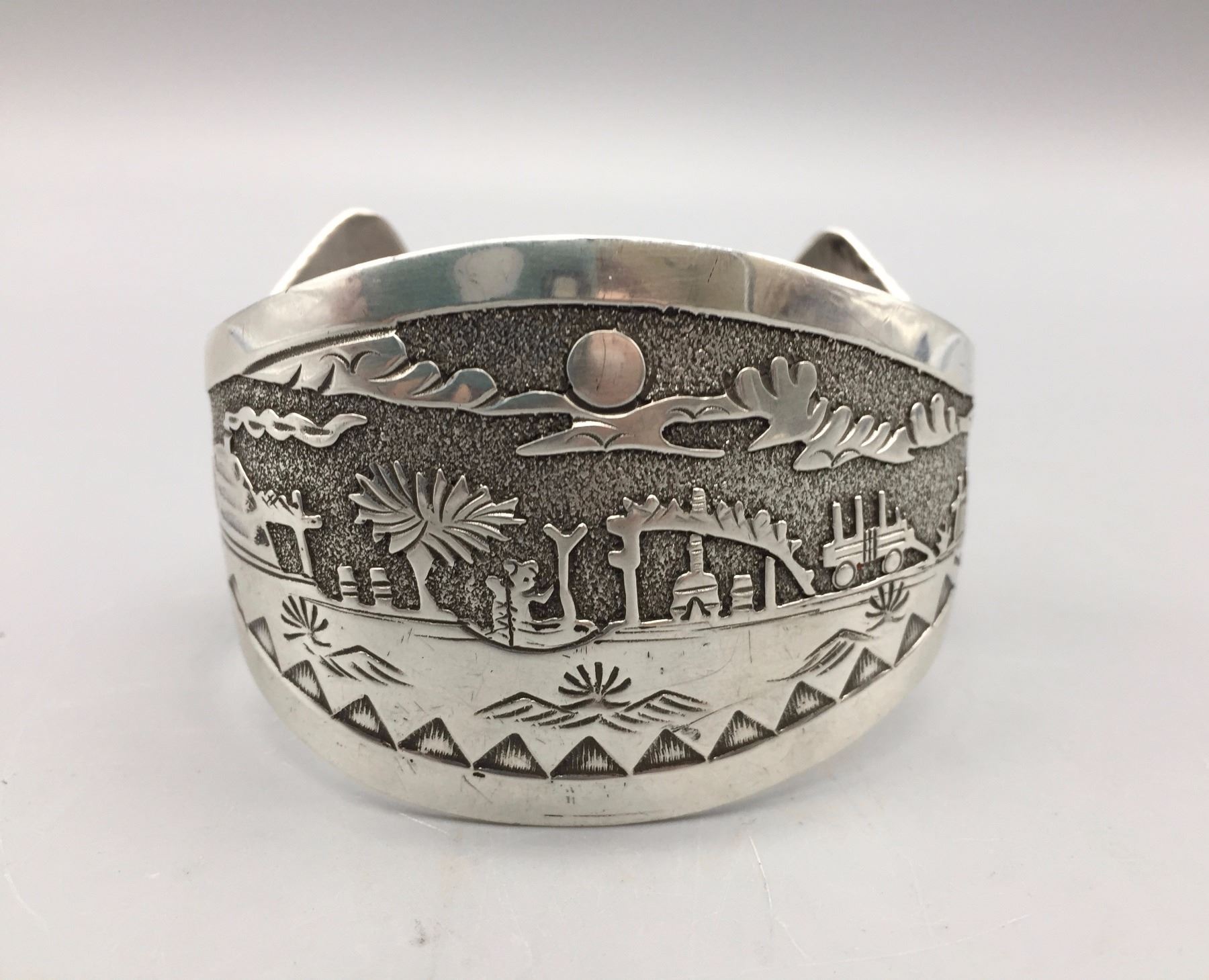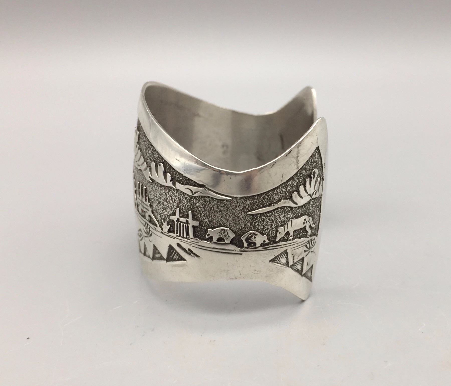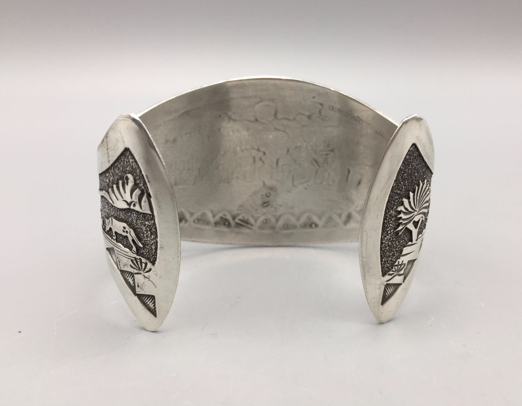 Description: Navajo sterling silver storyteller bracelet by Gibson Gene. Maker: Hallmarked with Gibson Gene’s mark. Navajo Approx. Age: Fairly modern. Size: Inside circumference measures approx. 5 3/4“ with a 1 1/4” gap (making this bracelet fit about a 7” wrist). It is 1 3/4” wide across the face and weighs 39.7 g. Condition: Good for its age, normal wear expected. Please look closely at the pictures - they are an important part of our description. Shipping: There will be a $5 handling / packaging fee for shipping this lot. The actual cost of postage will be added on top of that.