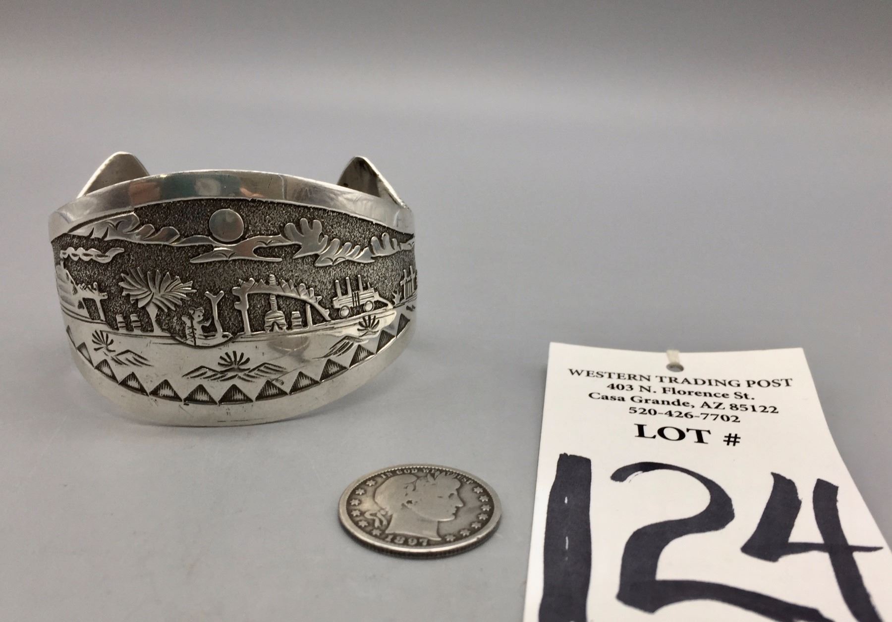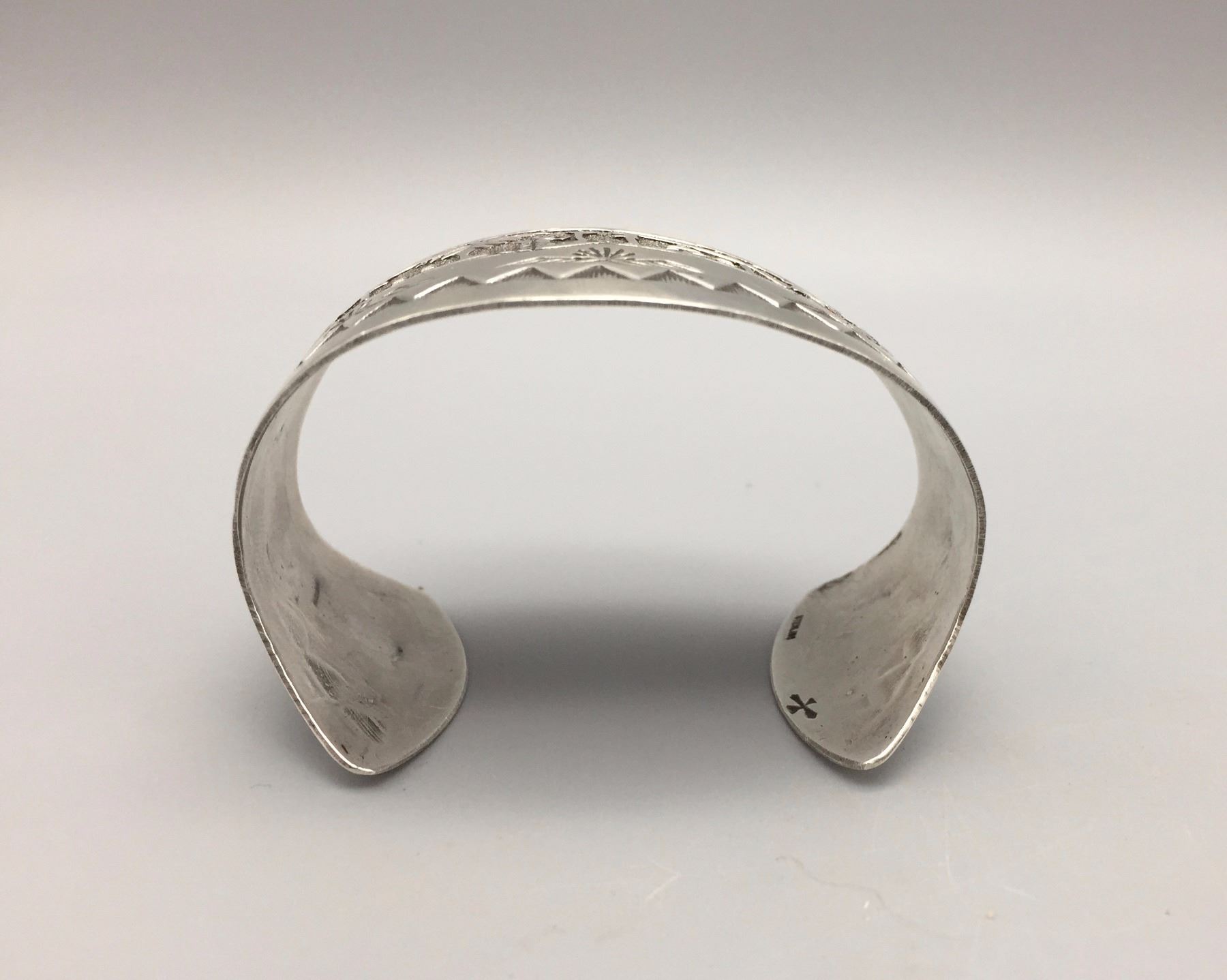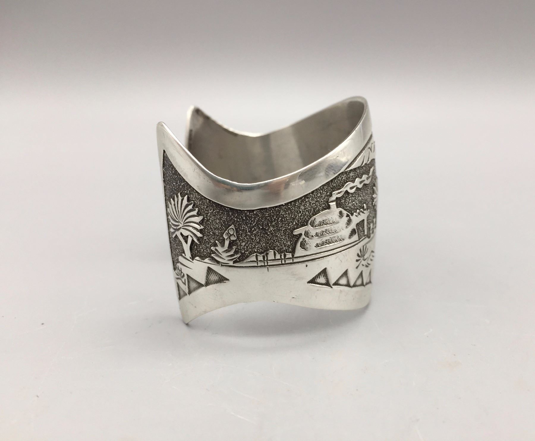 Description: Navajo sterling silver storyteller bracelet by Gibson Gene. Maker: Hallmarked with Gibson Gene’s mark. Navajo Approx. Age: Fairly modern. Size: Inside circumference measures approx. 5 3/4“ with a 1 1/4” gap (making this bracelet fit about a 7” wrist). It is 1 3/4” wide across the face and weighs 39.7 g. Condition: Good for its age, normal wear expected. Please look closely at the pictures - they are an important part of our description. Shipping: There will be a $5 handling / packaging fee for shipping this lot. The actual cost of postage will be added on top of that.