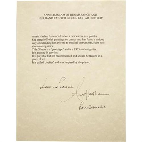 <B>Gibson Acoustic Guitar Hand-Painted by Annie Haslam Singer of Renaissance, Titled "Jupiter."</B></I> This striking piece is painted in acrylics on a mid-sixties Gibson student model acoustic. Haslam is well-known for her pioneering work in the world of Folk Rock, and she has now embarked on a new career as a painter. Acrylic swirls cover the entire body of the guitar, with details on the headstock and inside the sound-hole. The guitar is accompanied by a letter signed by Haslam as well as a signed 8" x 10" photo. In Very Fine condition.<BR><BR><b>Shipping:</b> Musical Instruments, Large (<a target="_blank" href="http://www.heritageauctions.com/common/shipping.php">view shipping information</a>)