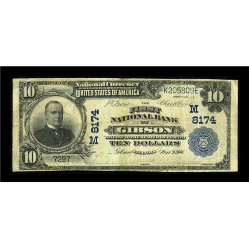 <B>Gibson, IL</B></I> - $10 1902 Plain Back Fr. 625 <B>The First NB</B></I> Ch. # (M)8174<BR>Just $4380 was left outstanding for the sole issuer in town. The signatures are barely there and a pinhole or two are spotted. <B>Fine.</B></I><BR><I>From The Lincoln Collection</B></I><BR><BR><b>Shipping:</b> Coins & Currency (<a target="_blank" href="http://www.heritageauctions.com/common/shipping.php">view shipping information</a>)