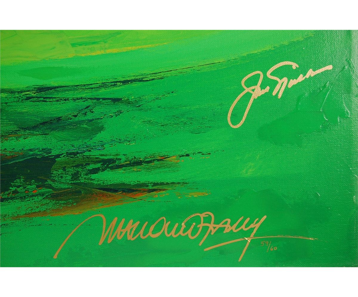 Large giclee hand embellished on canvas of golf scene. Hand signed in gold marker by golf legends Jack Nicklaus and Malcum Farley. Numbered 59/60. 40"W x 30"H