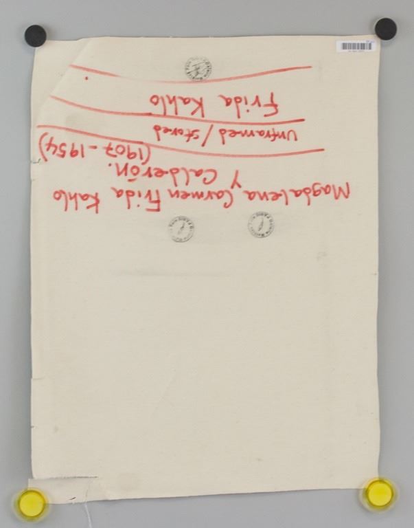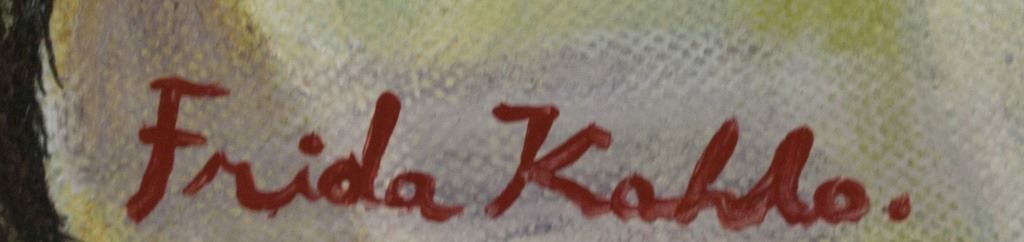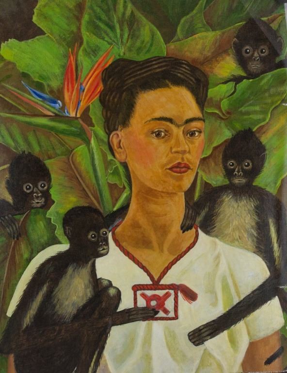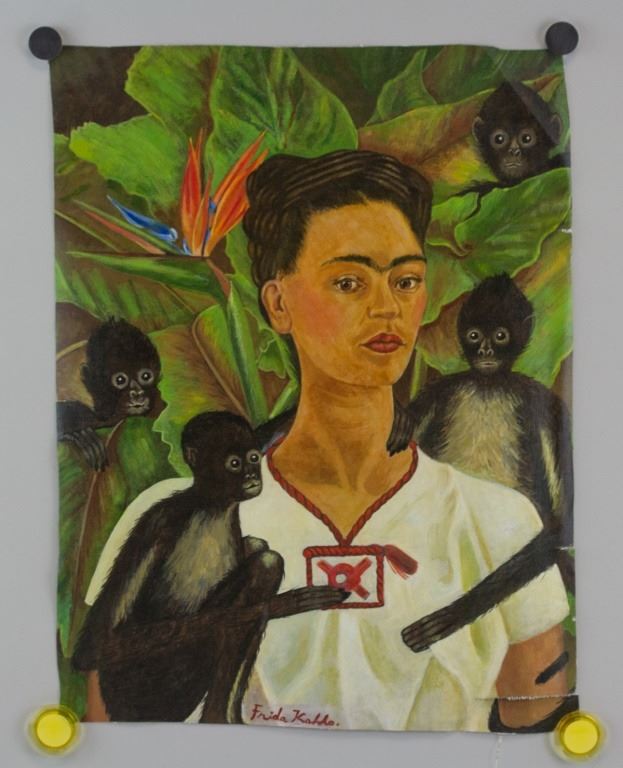 Giclee on canvas. Featuring portrait of Kahlo with monkeys and a bird of paradise flower. Signed "Frida Kahlo" to the bottom center. Canvas is heavily damaged. "Galerie Mathias Fels PARIS" stamped on verso. "Magdalena Carmen Frida Kahlo y Calderon (1907-1954) Unframed/Stored Frida Kahlo" inscribed in red on verso. 51 x 39 cm (20 x 15.5 inches). Provenance: This lot carries limited provenance from a Private British collection