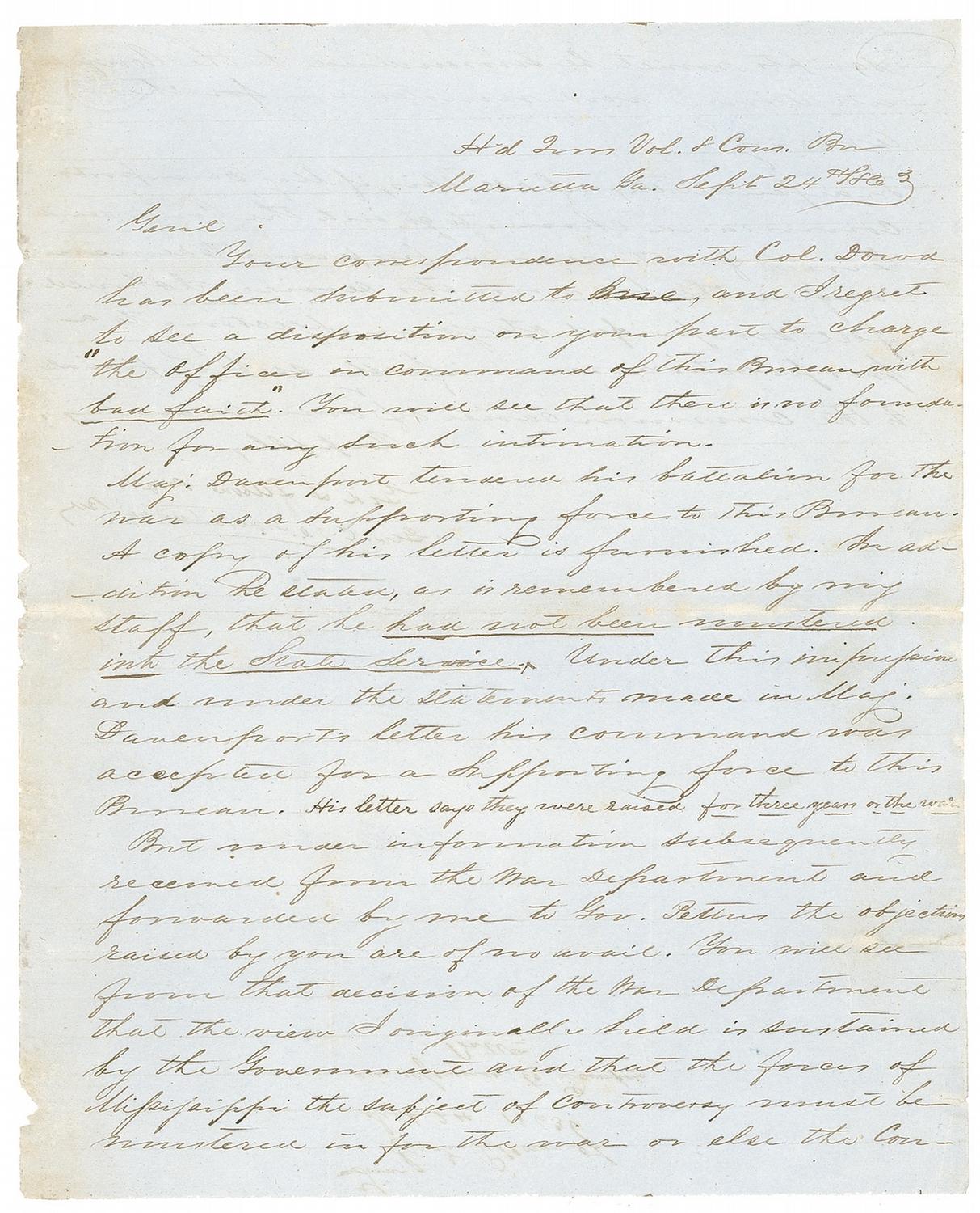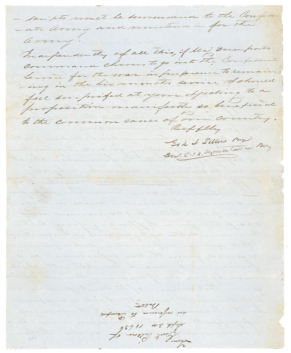 In…of all this, if Maj. Davenport’s command choses to go into the Confederate Service for the was in preference to remaining in the six months service, I should feel surprised at your objecting to a proportion manifested so beneficial to the common cause of our country.” Intersecting folds, scattered light toning, mainly to folds and left edge, and some light chipping along left edge, otherwise fine condition.