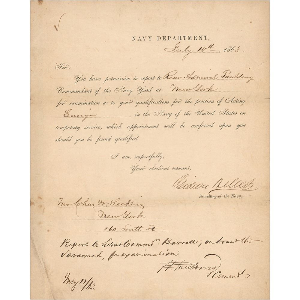 Civil War–dated partly-printed DS, one page, 8 x 10, July 10, 1863. Secretary of the Navy Welles grants Charles W. Seeking "permission to report to Rear Admiral Paulding Commandant of the Navy Yard at New York for examination as to your qualifications for the position of Acting Ensign in the Navy of the United States." Signed at the conclusion by Welles, and endorsed below by Paulding, directing him to report to Commander Edward Barrett onboard the USS Savannah for examination. In very good condition, with creasing, soiling, and old tape reinforcements on the back of the folds.