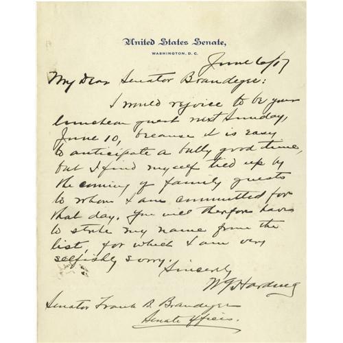 <B>Warren G. Harding Scarce Autograph Letter -- Turning Down a Good Time!</B></I> Autograph Letter Signed, <I>as Senator,</B></I> 1 page, on the letterhead of the United States Senate, Washington, June 6, 1917; to Connecticut Senator Frank Brandegee, a member of Harding's informal drinking and claver club, the "Little Mothers", which met, convivially, after work in the lower rooms of the Hotel Bon Ton. In Very Fine condition. With typical bonhomie, Harding pens this rare letter to his brother "Little Mother." In full: "<I>I would rejoice to be your luncheon guest speaker next Sunday, June 10th, because it is easy to anticipate a bully good time, but I find myself tied up by the coming of family guests to whom I am committed for that day. You will therefore have to strike my name from the list, for which I am very selfishly sorry.</B></I>" From the Henry E. Luhrs Collection. Accompanied by LOA from PSA/DNA.