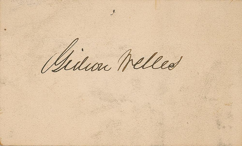 Secretary of the Navy under Lincoln and Johnson (1802–1878). Ink signature, “Gideon Welles,” on an off-white 3.25 x 2 card. In very good condition, with scattered toning and soiling.