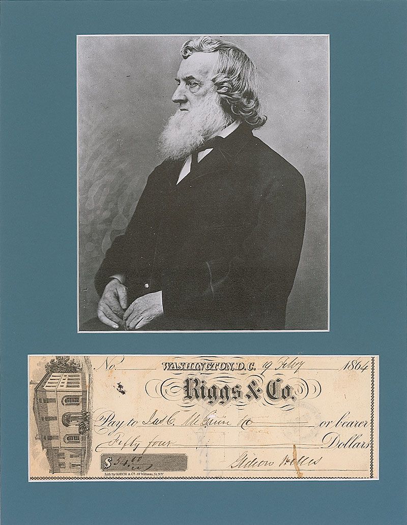 Civil War-dated Riggs & Co. bank check, 7 x 2.5, filled out and signed by Welles, “Gideon Welles,” payable to Jas. C. McGuire & Co. for $54, February 19, 1864. Matted with a photo of Welles to an overall size of 8.25 x 10.75. In very good condition, with