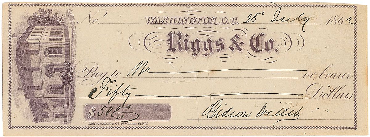 Civil War–dated bank check, 7.5 x 2.75, filled out and signed by Welles, “Gideon Welles,” payable to bearer for $50, July 25, 1862. Subtle intersecting folds and an expected cancellation cut passing through the first letter of the signature, otherwise fine condition.
