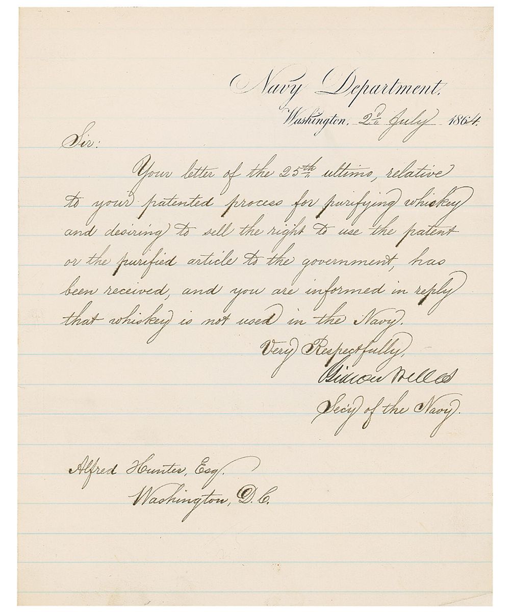 Civil War–dated LS, one page, lightly-lined, 7.75 x 9.75, Navy Department letterhead, Washington, July 2, 1864. Letter to an inventor. In part: “Relative to your patented process for purifying whiskey and desiring to sell the right to use the patent or the purified article to the government…you are informed in reply that whiskey is not used in the Navy.” In fine condition.